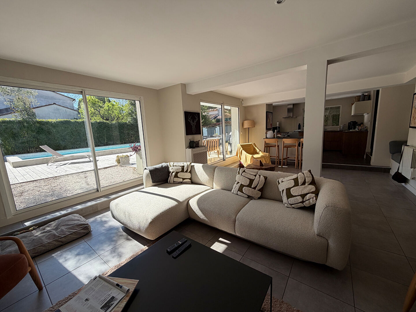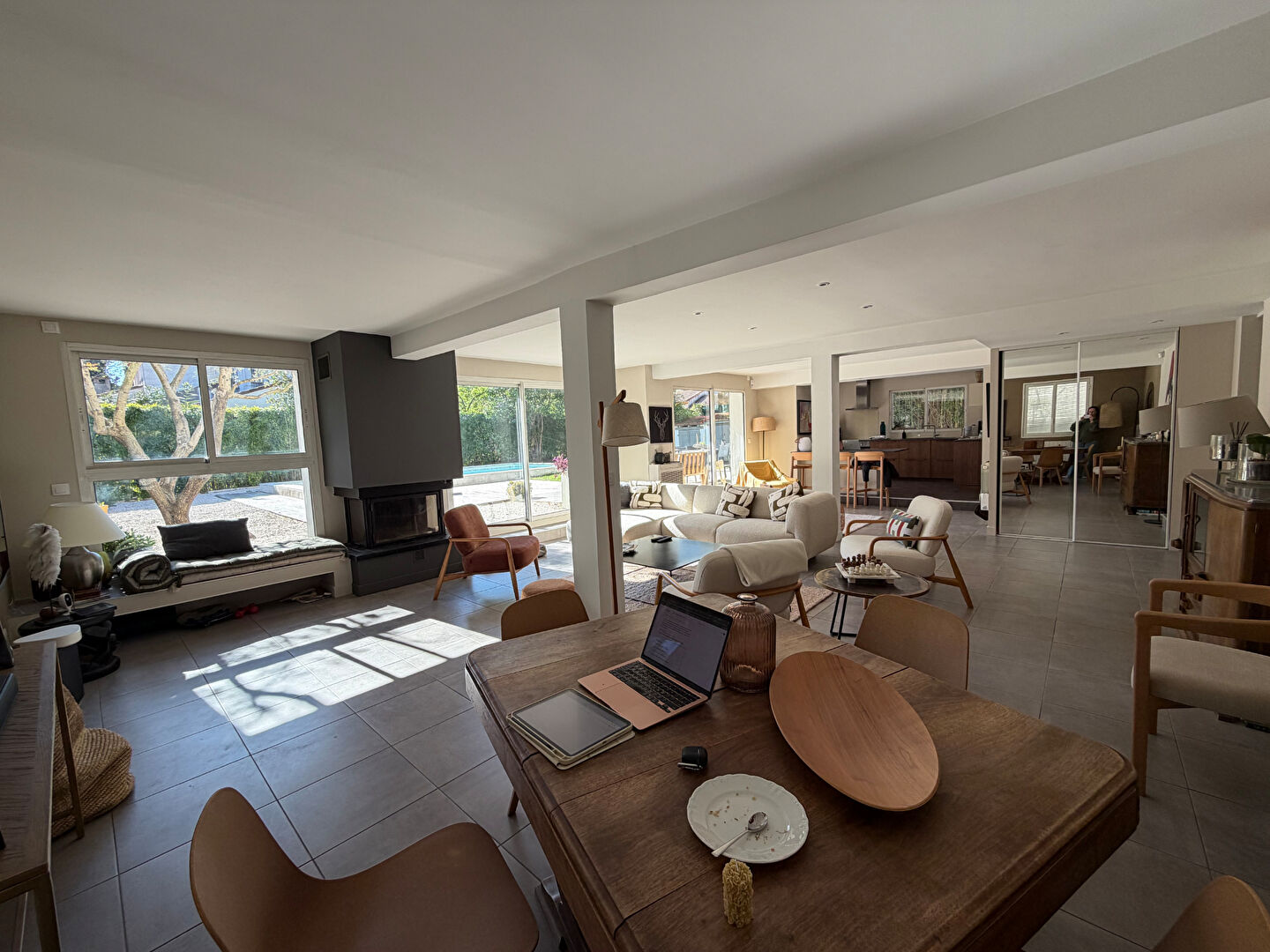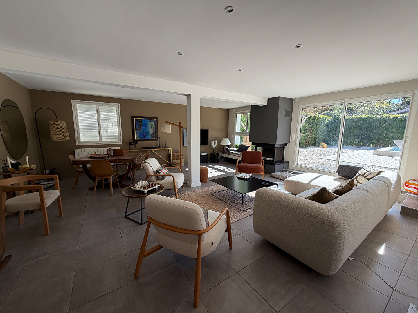 En rez de chaussée, vous trouverez une grande pièce à vivre (cheminée et climatisation) avec cuisine ouverte aménagée et équipée une buanderie avec lave linge et lave vaisselle), WC, deux garages et deux places de parkings devant la maison.
