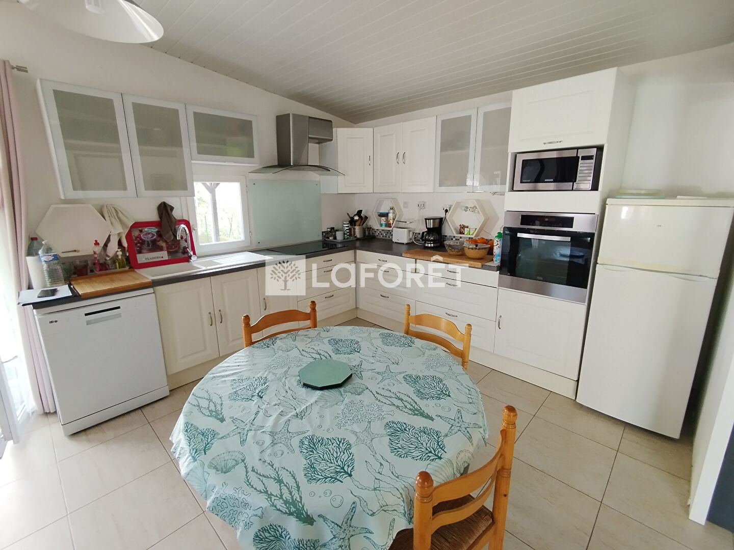 Séjour lumineux ouvert sur une cuisine aménagée et équipée