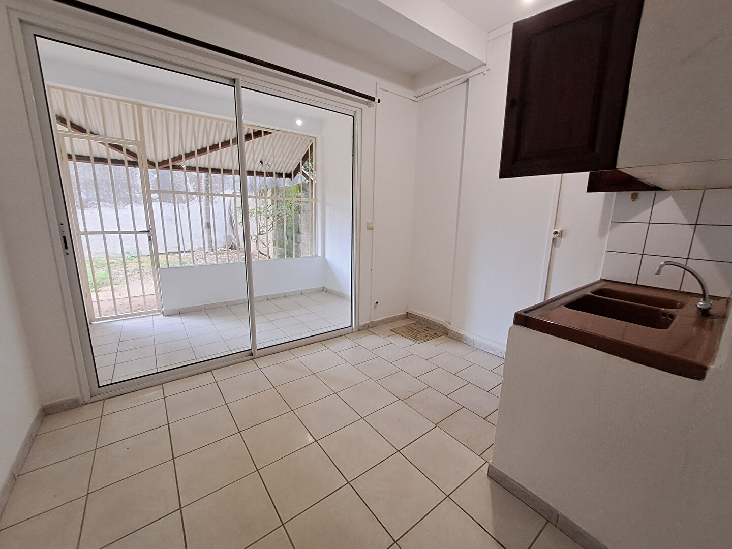 Appartement de deux pièces au rez-de-chaussée d'un immeuble R+2 avec un séjour, une cuisine aménagée, une terrasse, une salle d'eau avec W.C et une chambre avec placard.