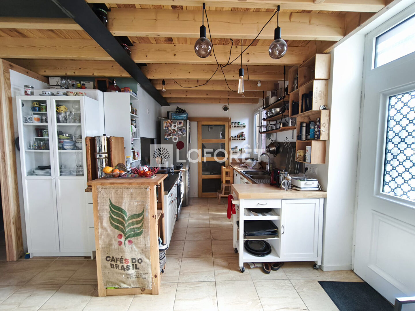 La maison se compose, au rez-de-chaussée, d'un spacieux salon avec cuisine ouverte. Une partie du séjour bénéficie d'une belle hauteur sous plafond sur deux niveaux, apportant volume et luminosité.