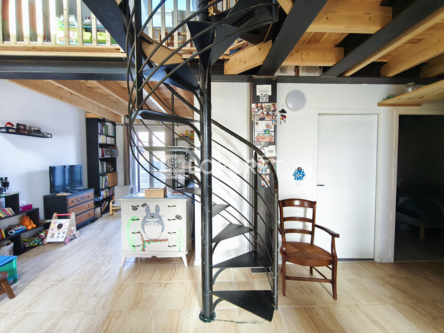 À l'étage, un bel escalier en fer forgé mène à deux espaces ouverts sur le salon. Vous y découvrirez une magnifique ferme en bois qui renforce le charme authentique de cette maison.