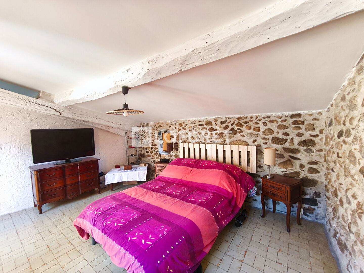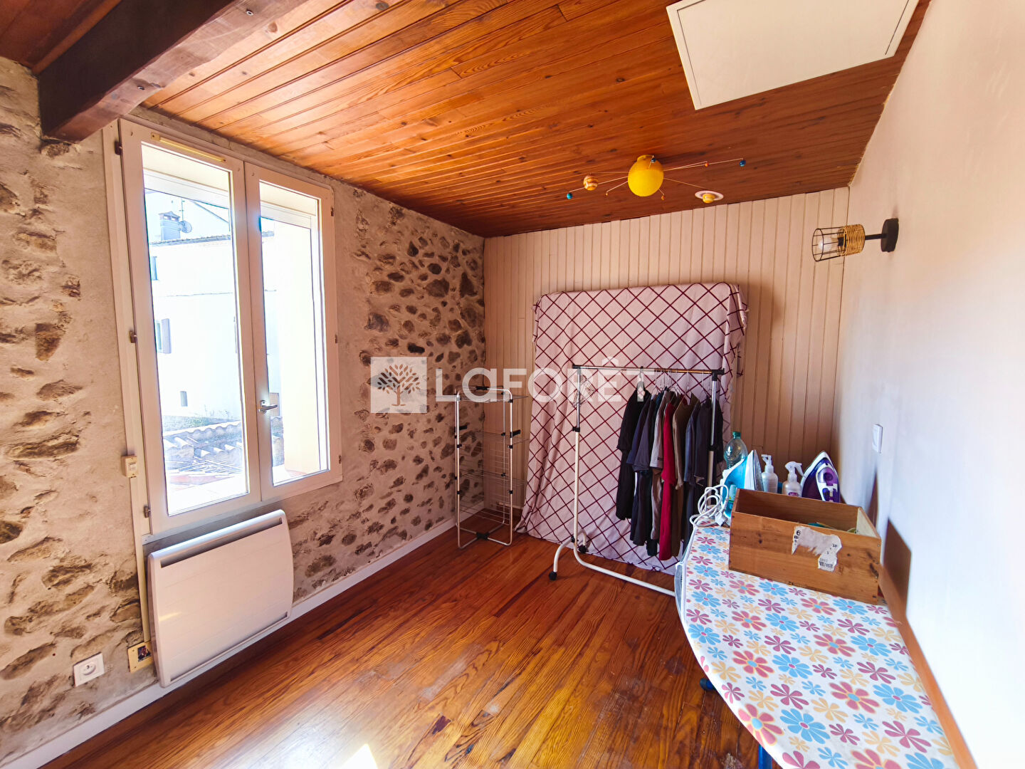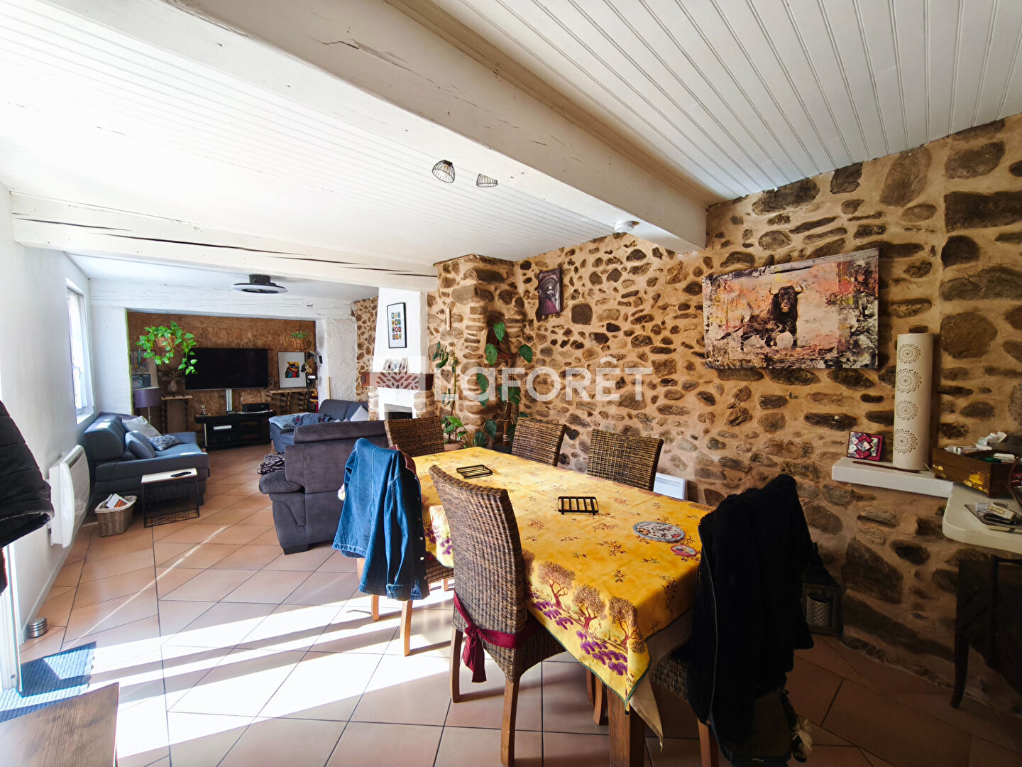 Dès l'entrée, vous découvrirez un salon séjour plein de caractère, mettant en valeur la pierre et le bois, avec une ambiance chaleureuse. L'insert apporte un confort appréciable et renforce le charme de la pièce.