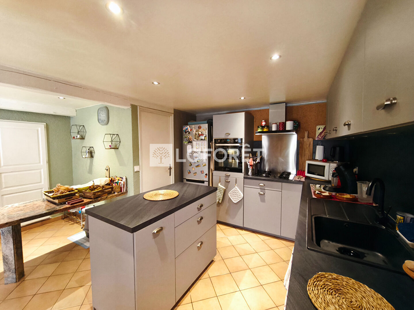 Dans la continuité, une cuisine équipée, rénovée et parfaitement optimisée, offre de nombreux rangements. Le rez-de-chaussée comprend également une salle de bain avec WC ainsi qu'une pièce actuellement utilisée comme espace de rangement, pouvant facilement être aménagée en chambre supplémentaire. Il est tout à fait possible de vivre de plain-pied.