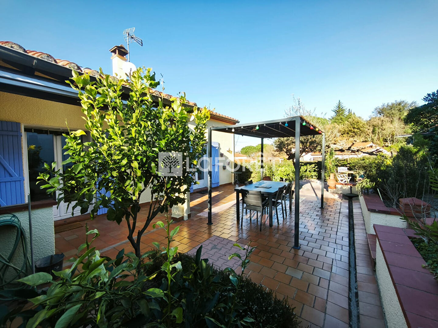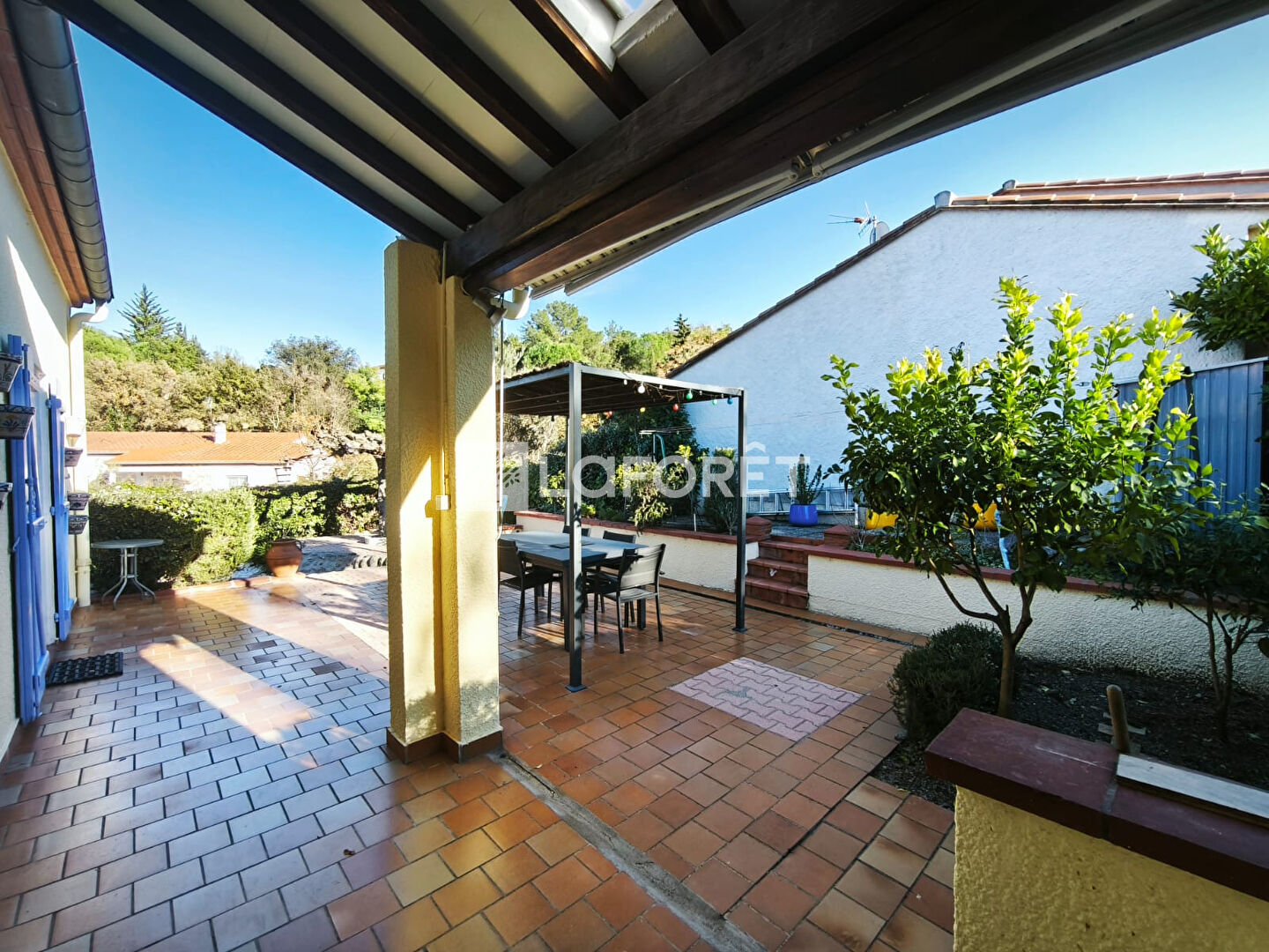 La maison est entourée sur ses trois faces par un extérieur arboré et très bien entretenu. À l'arrière, une belle terrasse accessible depuis le salon et la chambre de l'étage. Elle propose plusieurs espaces bien définis, dont une avancée de toiture apportant une ombre appréciable durant la période estivale.