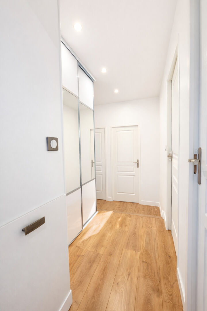 Le couloir dessert une suite parentale de plain-pied comprenant un dressing attenant et une salle d'eau, avec accès direct au jardin.