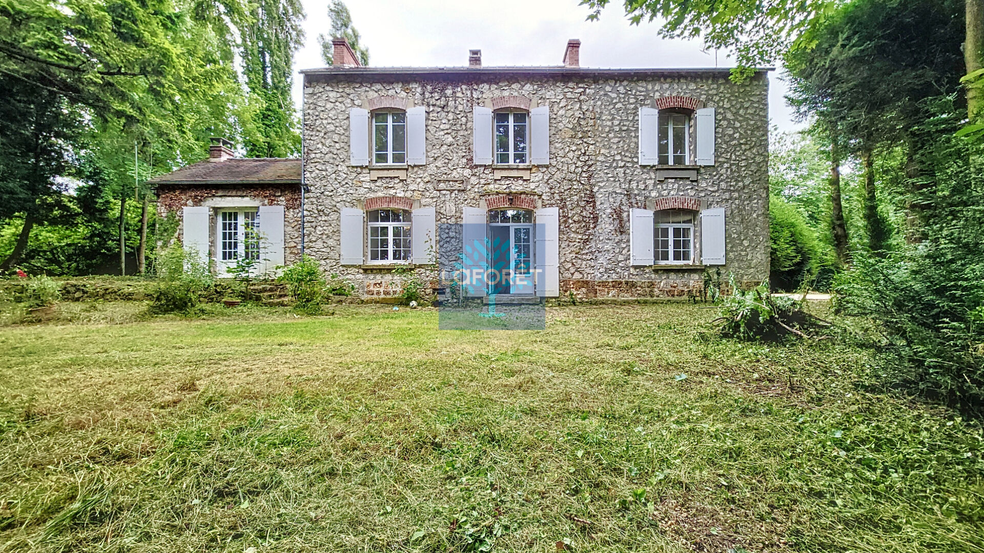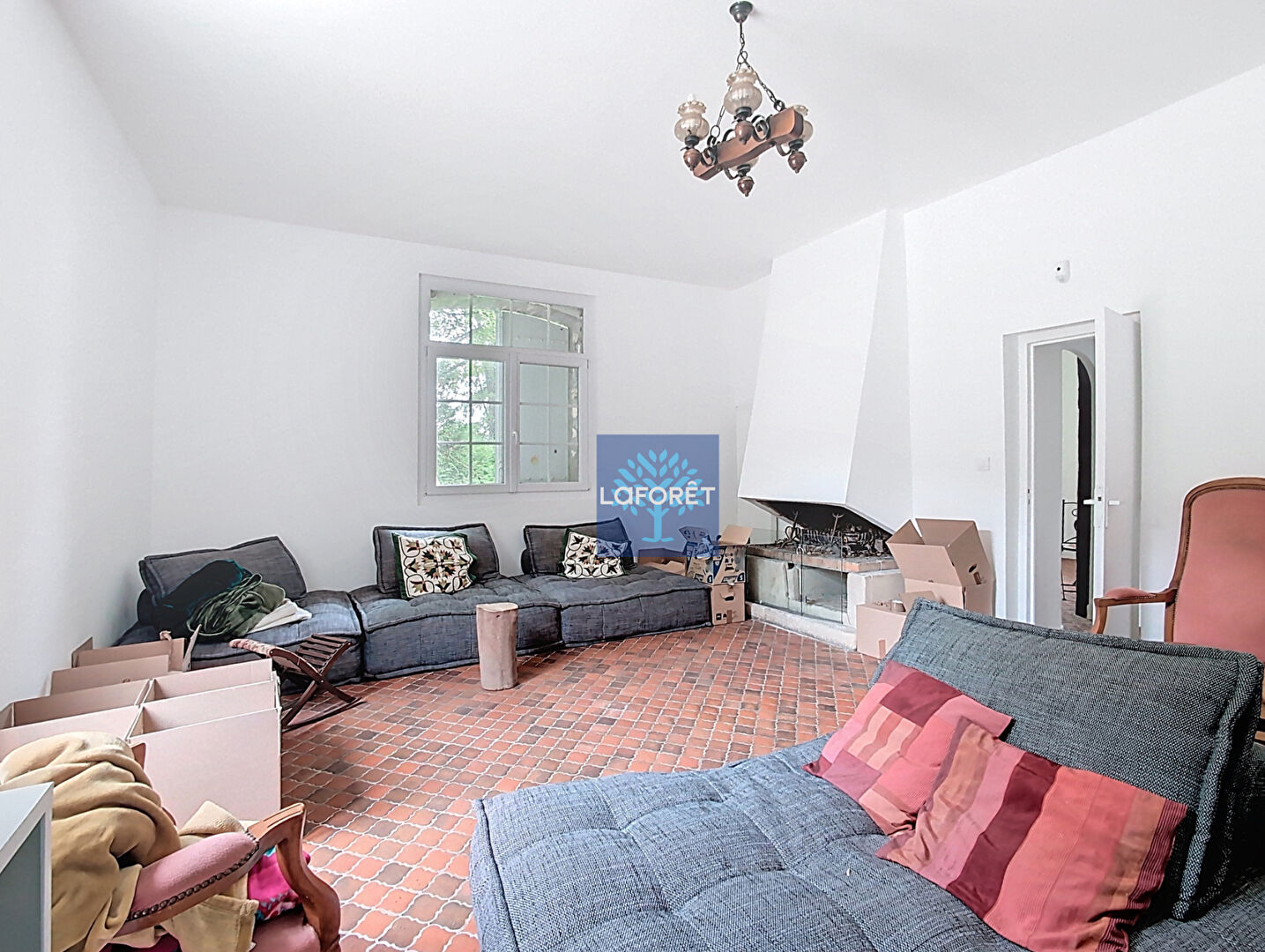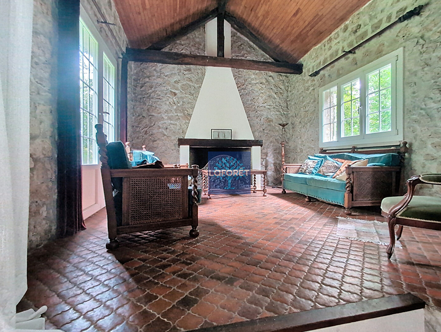 Elle dispose de beaux volumes dans un environnement paisible et arboré, sans aucun vis-à-vis, grâce à son jardin paysagé de 7 100 m². L'entrée mène à une réception spacieuse, séduisante par ses poutres apparentes, ses pierres visibles et sa cheminée majestueuse. La pièce est chaleureuse, avec une tommette au sol qui renforce cette ambiance conviviale.