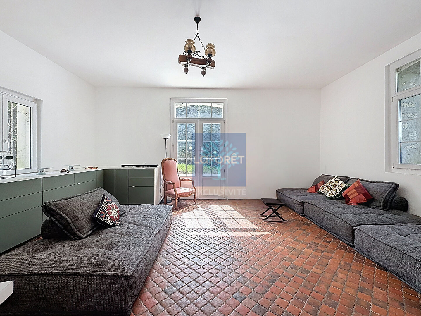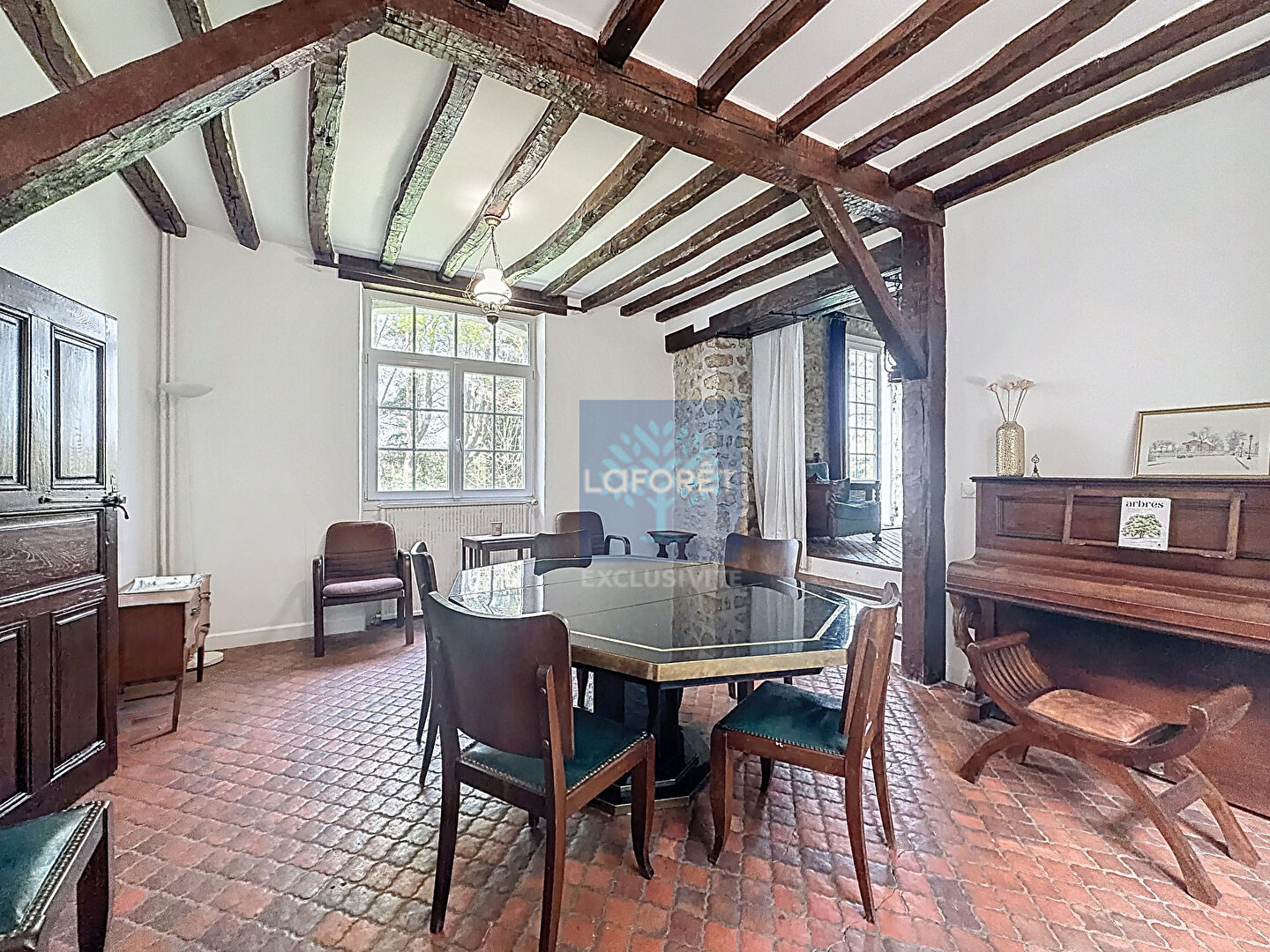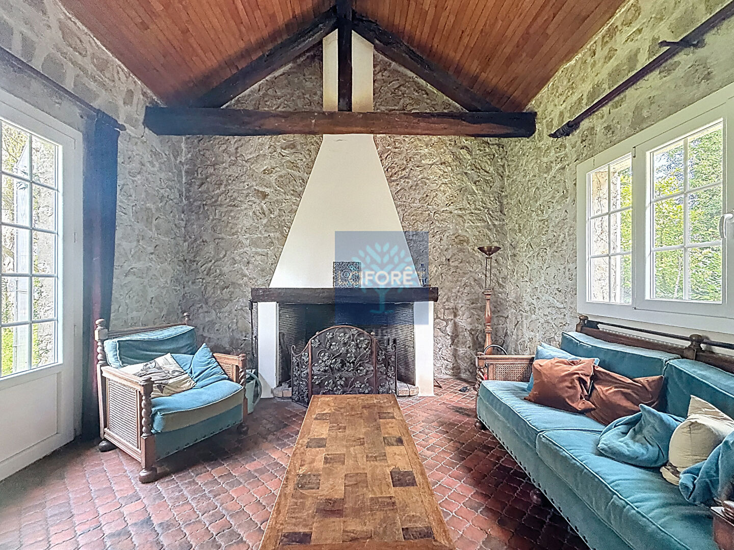 Elle dispose de beaux volumes dans un environnement paisible et arboré, sans aucun vis-à-vis, grâce à son jardin paysagé de 7 100 m². L'entrée mène à une réception spacieuse, séduisante par ses poutres apparentes, ses pierres visibles et sa cheminée majestueuse. La pièce est chaleureuse, avec une tommette au sol qui renforce cette ambiance conviviale.