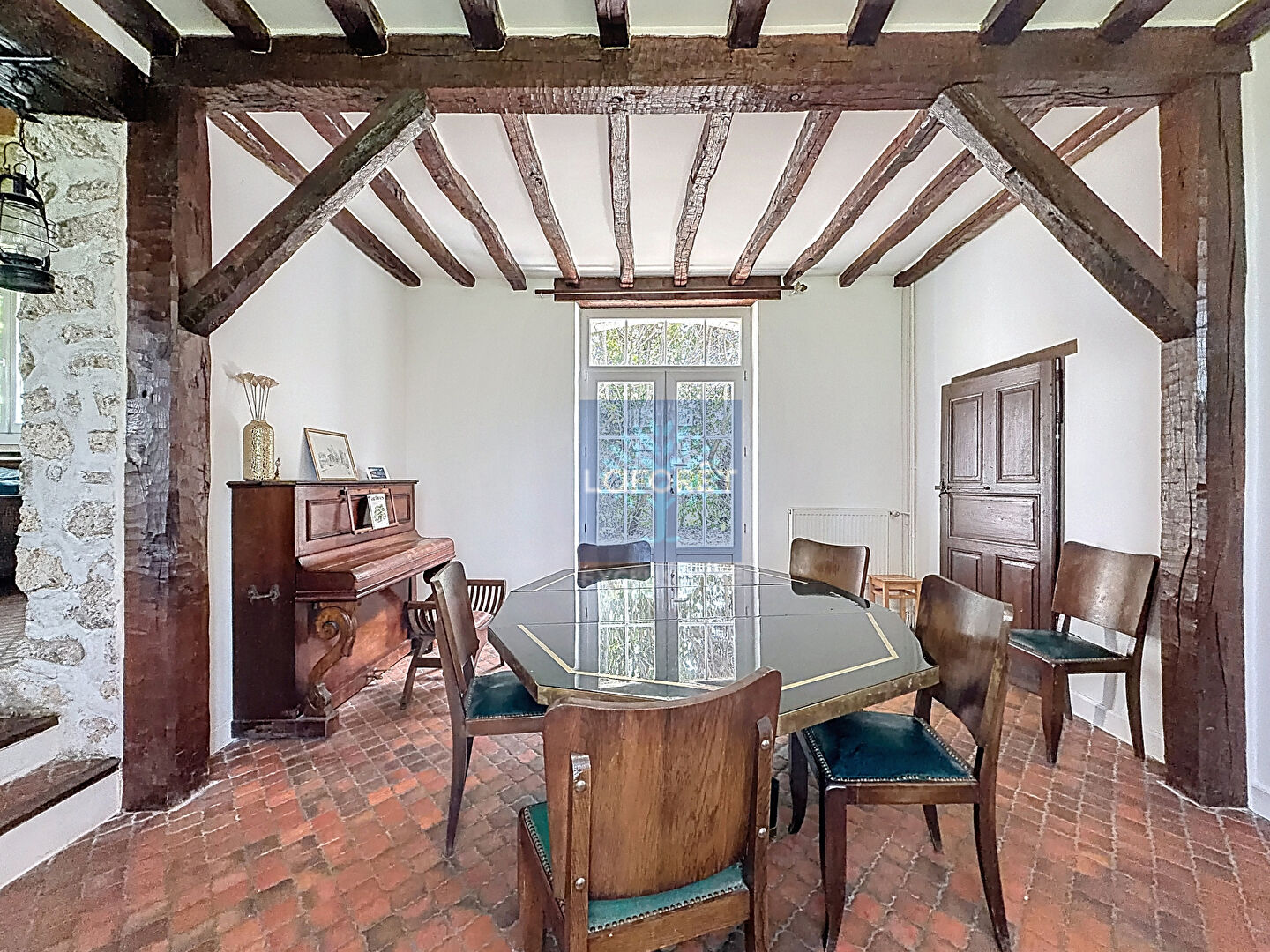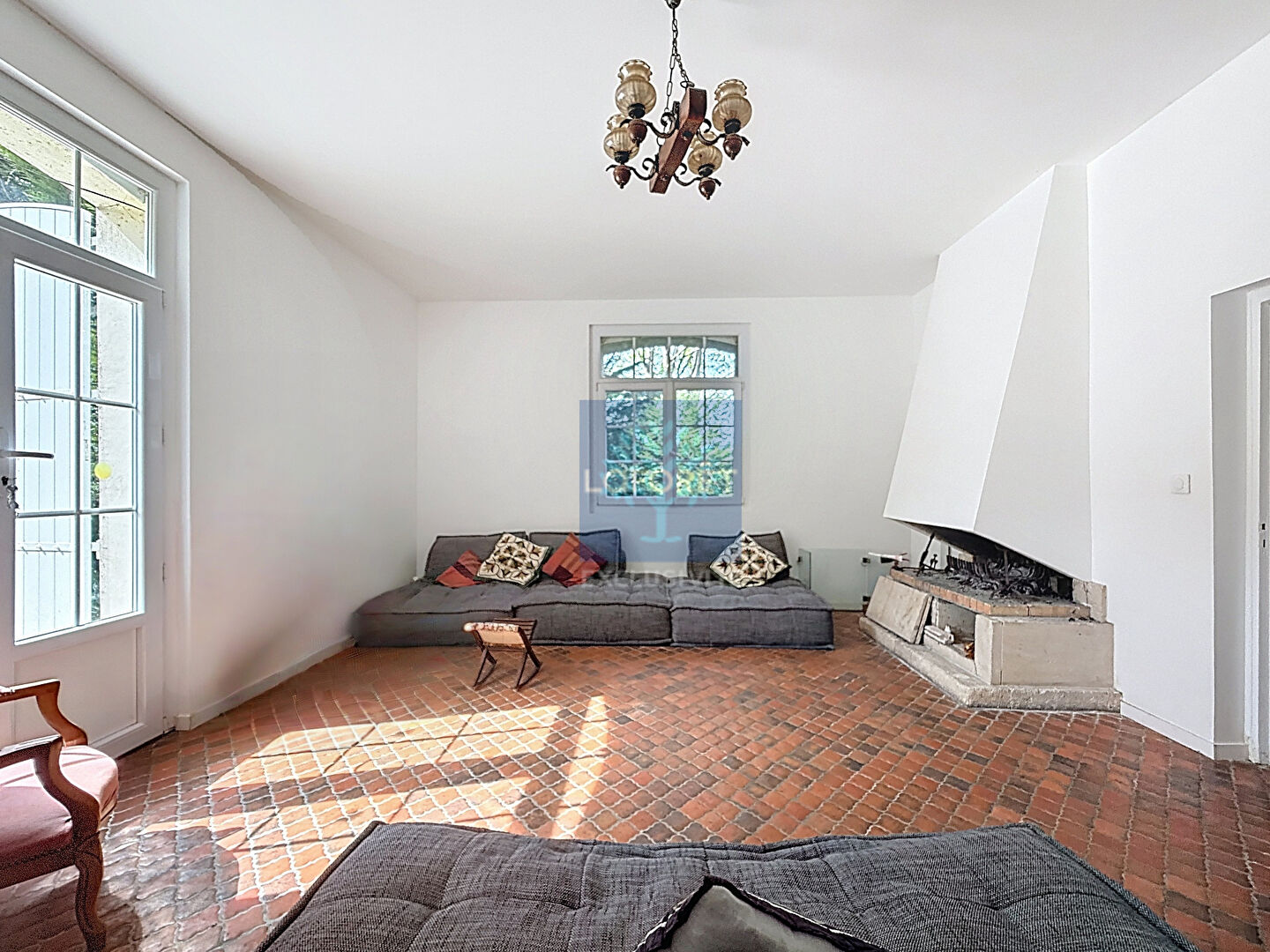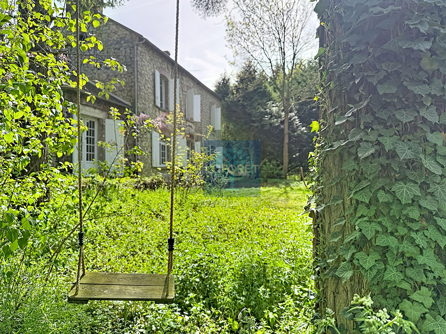 Elle dispose de beaux volumes dans un environnement paisible et arboré, sans aucun vis-à-vis, grâce à son jardin paysagé de 7 100 m². L'entrée mène à une réception spacieuse, séduisante par ses poutres apparentes, ses pierres visibles et sa cheminée majestueuse. La pièce est chaleureuse, avec une tommette au sol qui renforce cette ambiance conviviale.