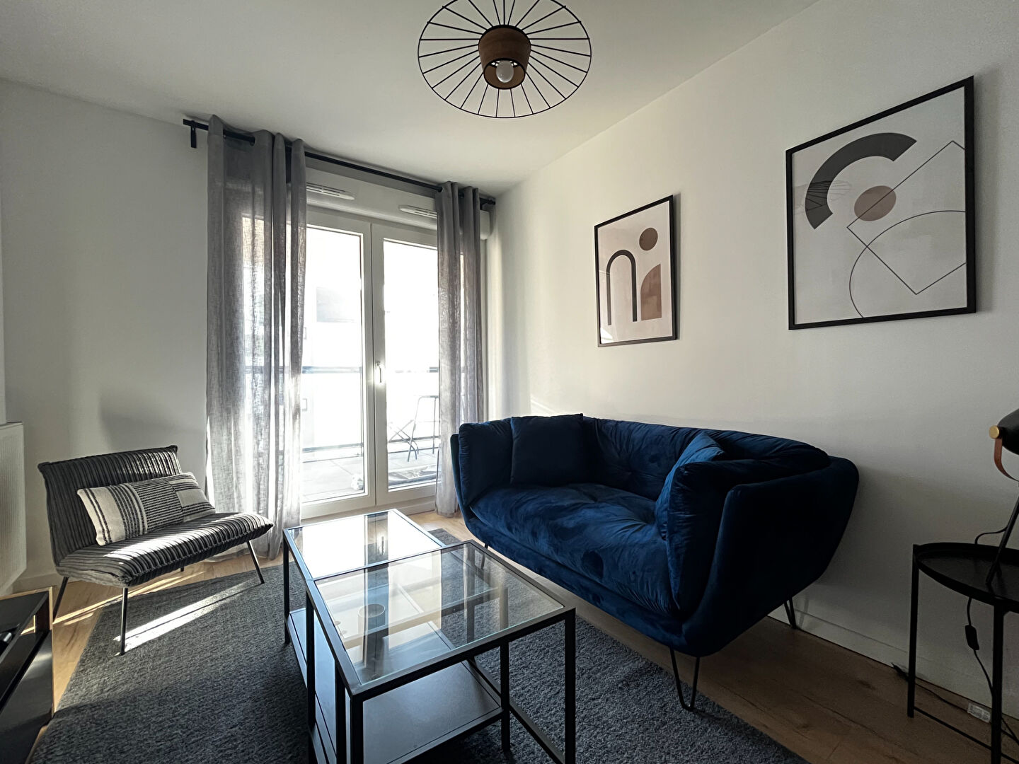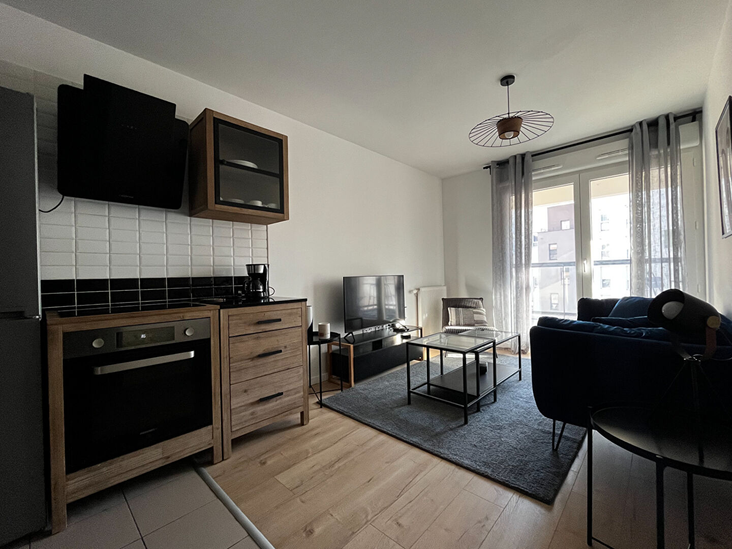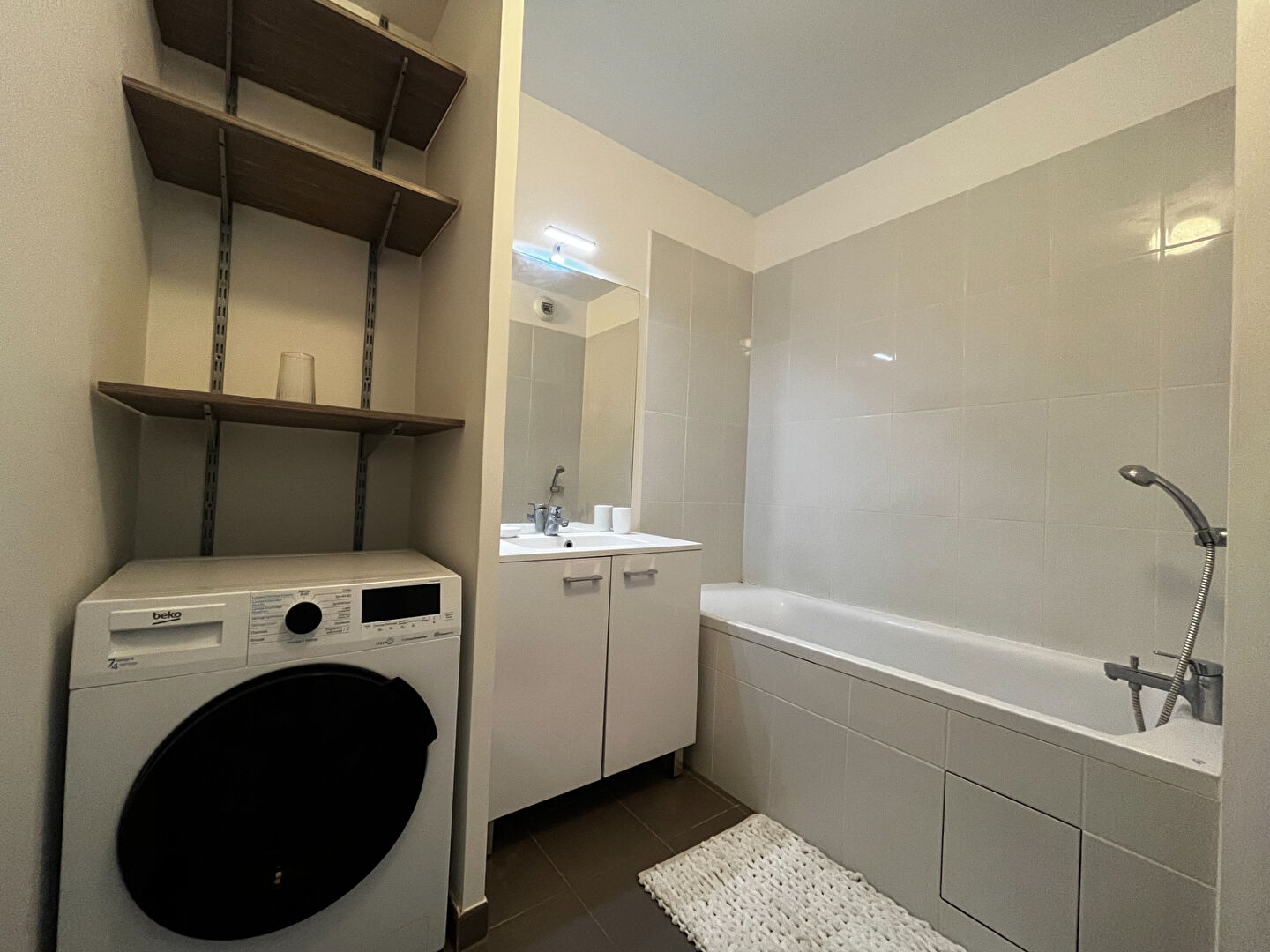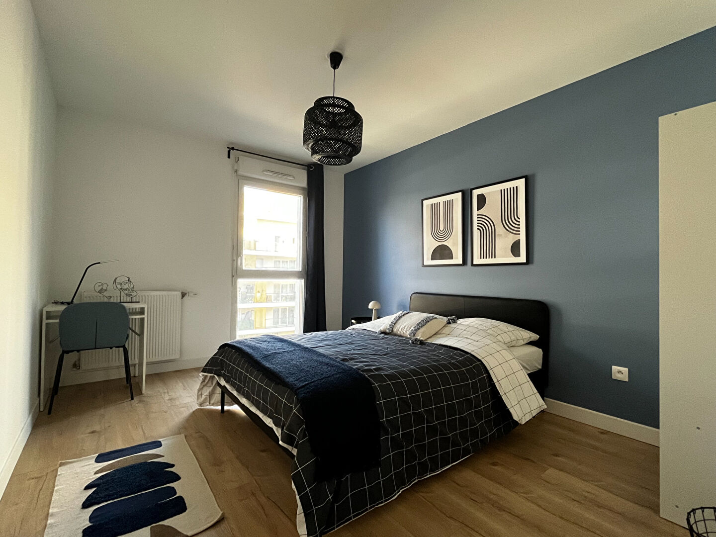 L'appartement se compose d'un séjour lumineux, d'une cuisine entièrement équipée (lave-vaisselle, réfrigérateur, micro-ondes?), de trois chambres aménagées avec bureaux et rangements, d'une salle de bain avec machine à laver, de WC séparés ainsi que d'un balcon.
