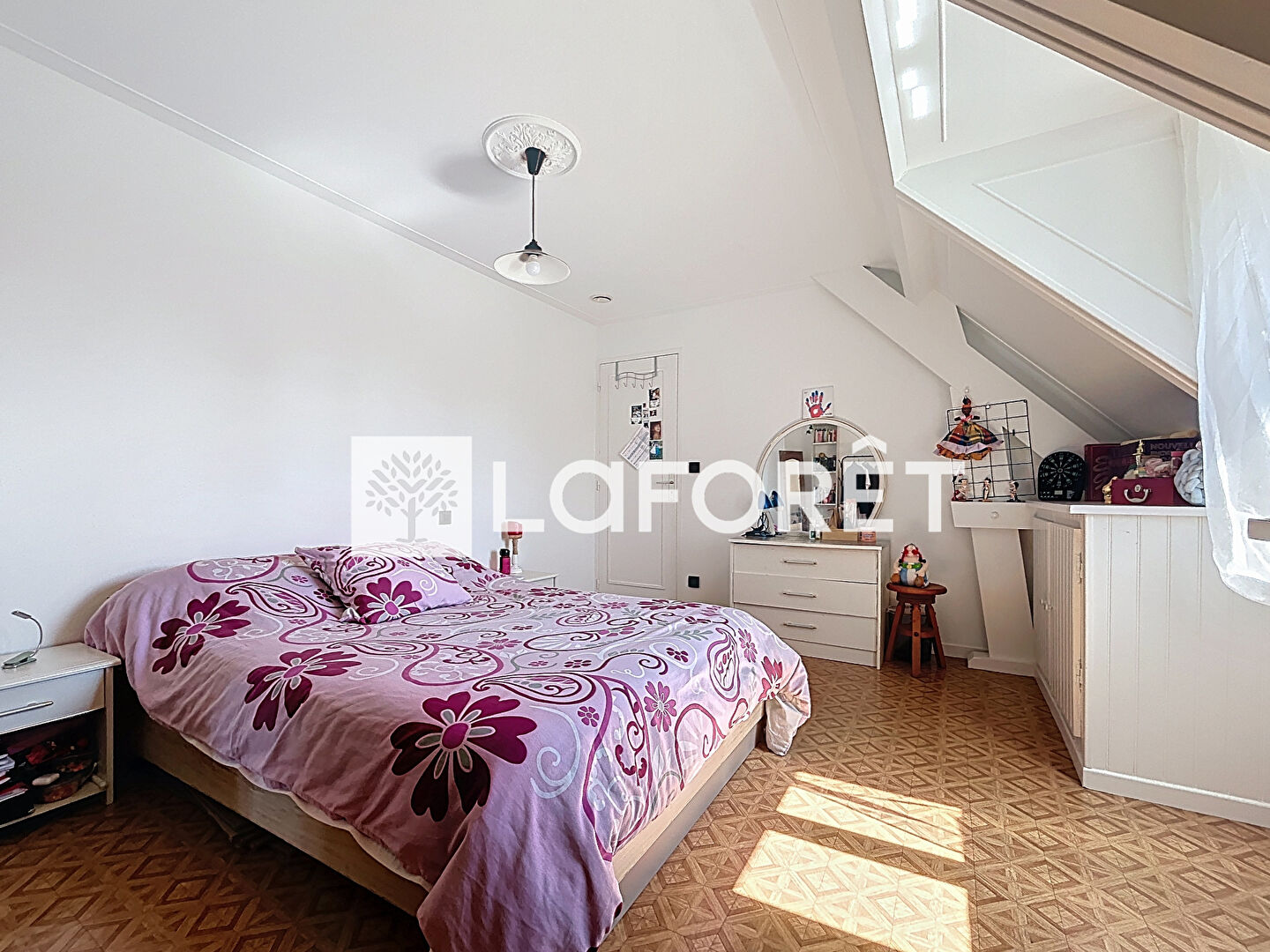 A l'étage vous accédez à un agréable palier pouvant accueillir un espace bureau qui dessert 4 belles chambres aux beaux volumes, une salle de bains et un WC séparé.