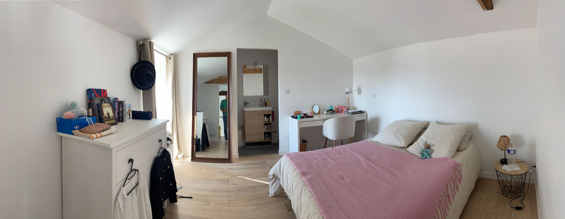 À l'étage, une mezzanine pourra accueillir un espace bureau ou un coin détente, et une chambre supplémentaire dispose de sa propre salle d'eau et WC.