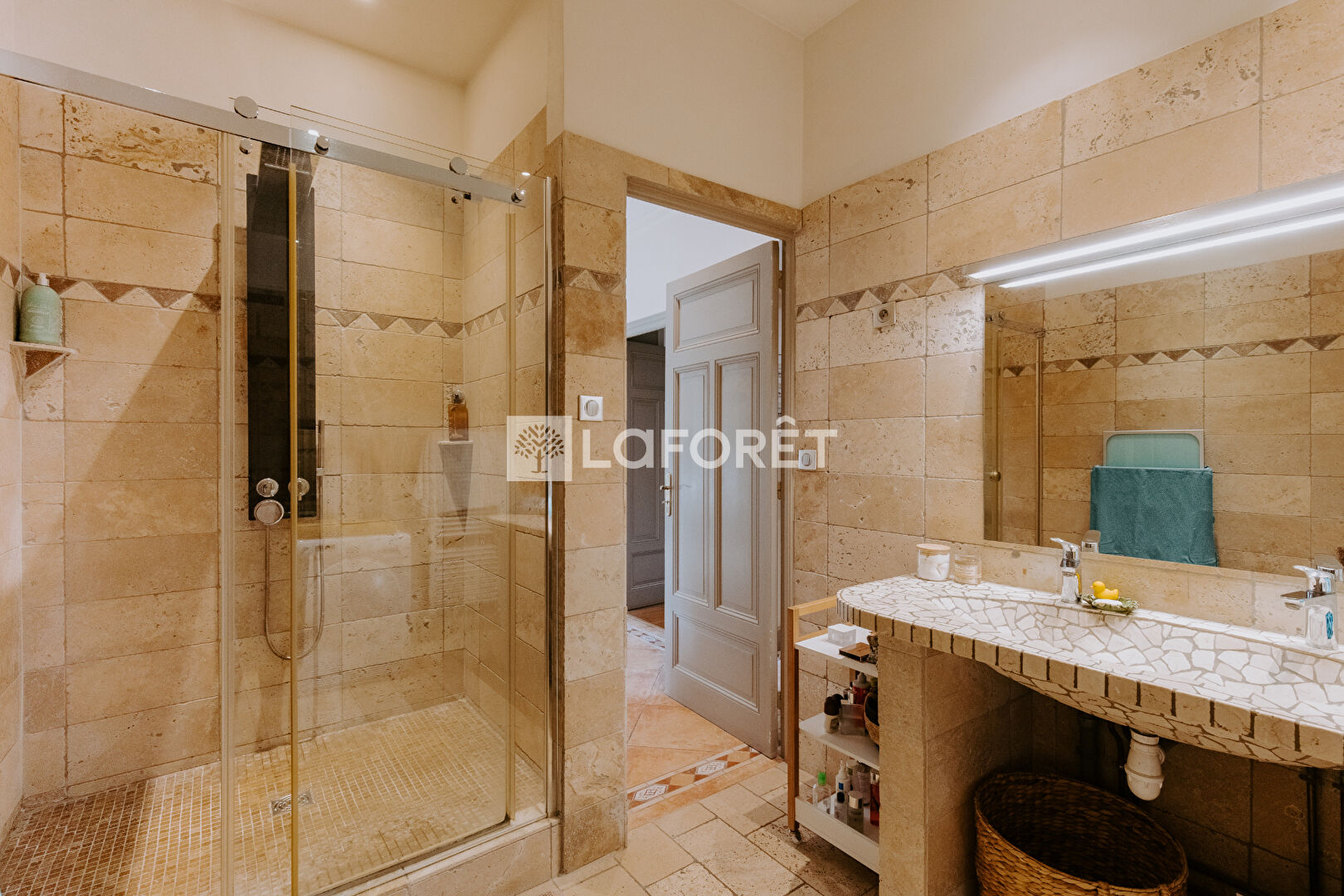 Salle d'eau en travertin avec douche à l'italienne