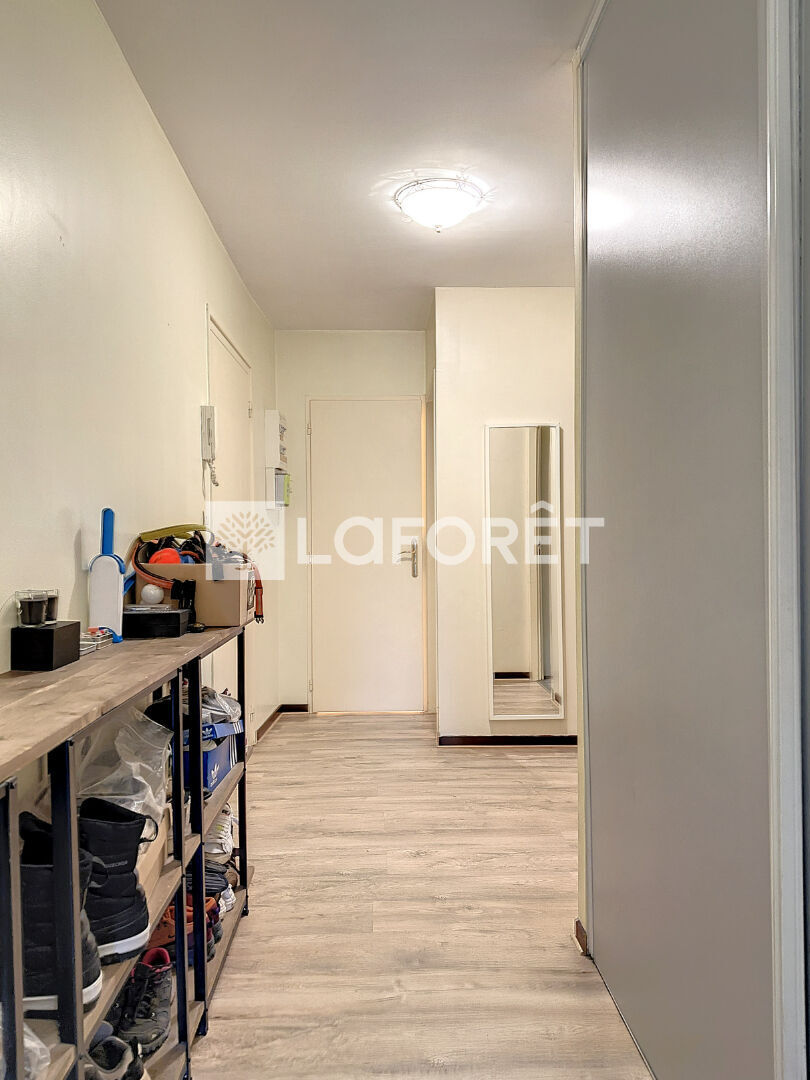 Un grand couloir avec placards de rangements qui donne accès à une pièce de vie et son parquet bois. Une cuisine ouverte aménagée, deux grandes chambres d'environ 15 m² ainsi qu'une salle de bains et WC.