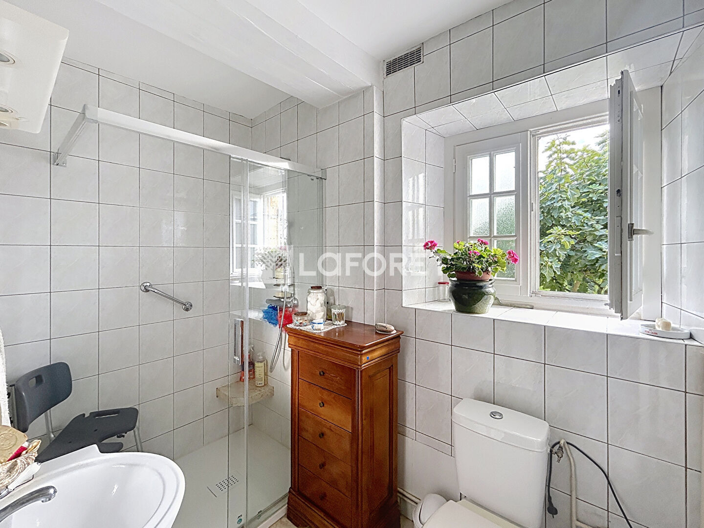 À l'extérieur, vous profitez d'une agréable terrasse exposée plein sud, de deux garages et d'un grand terrain arboré.