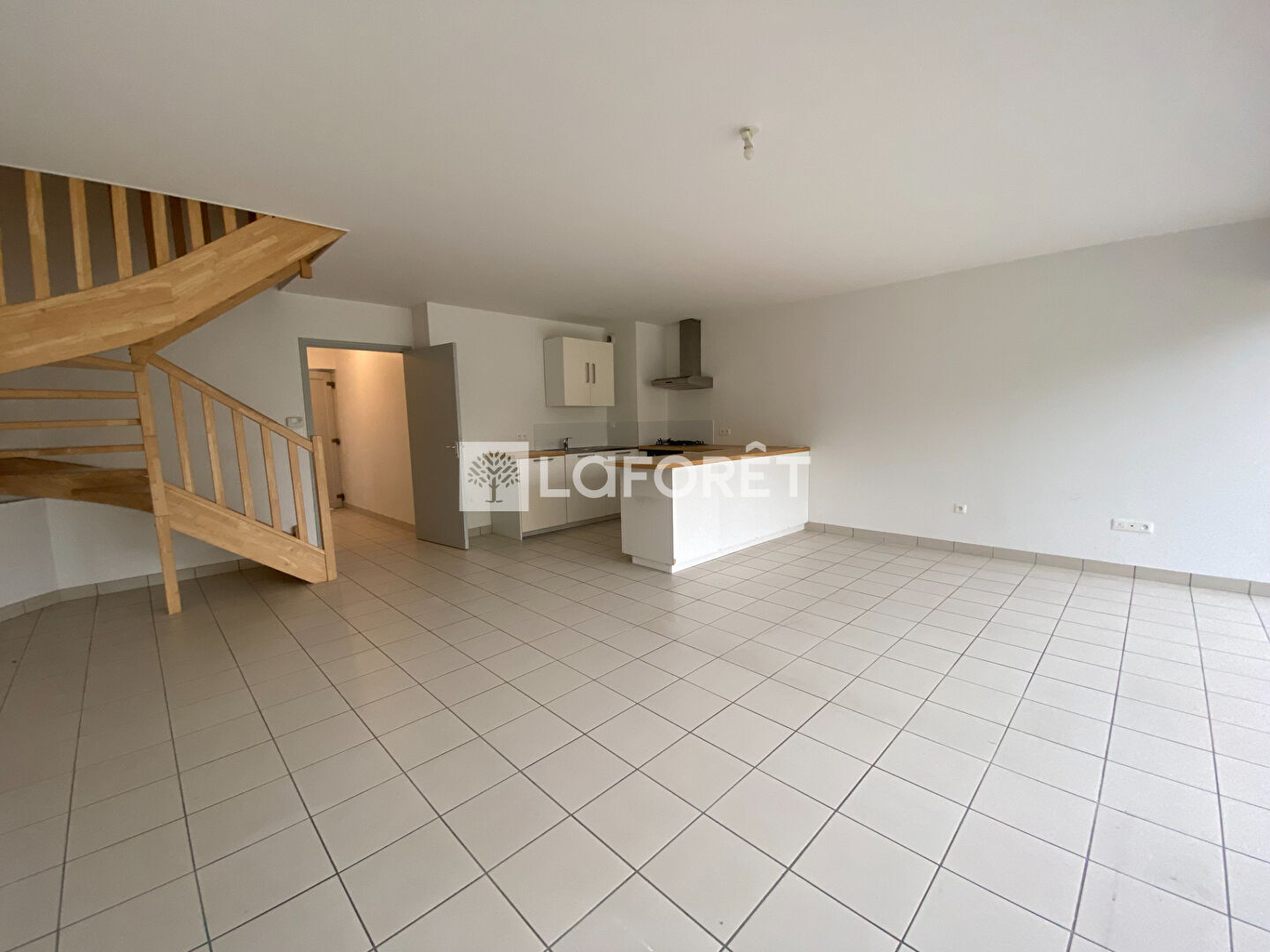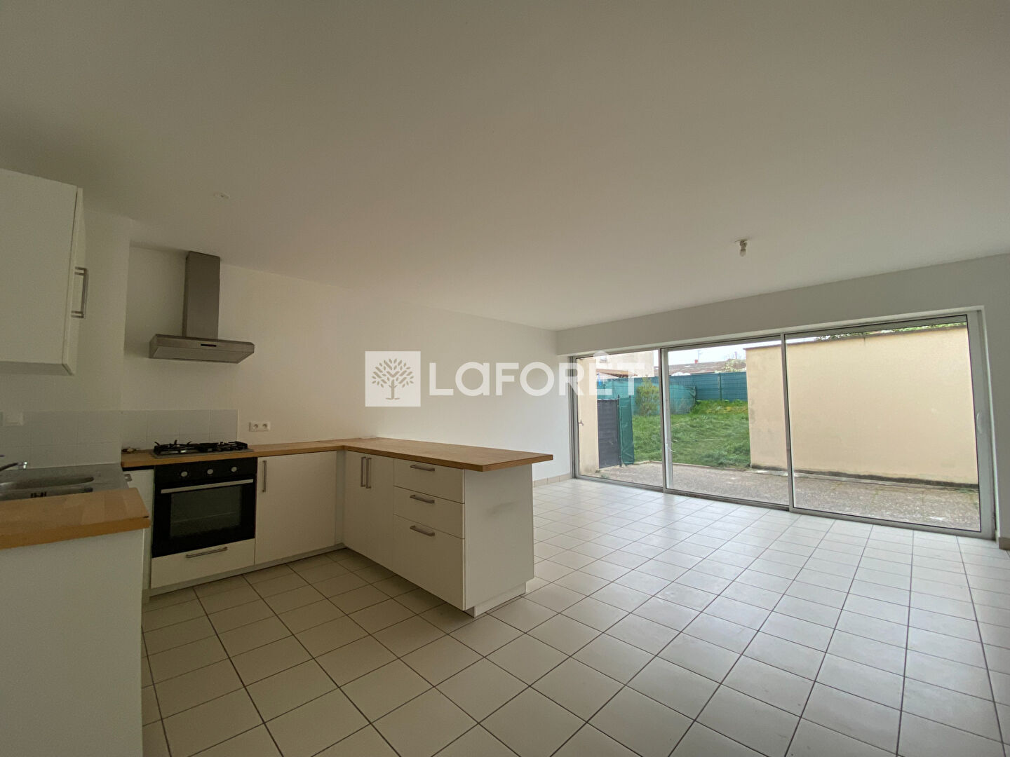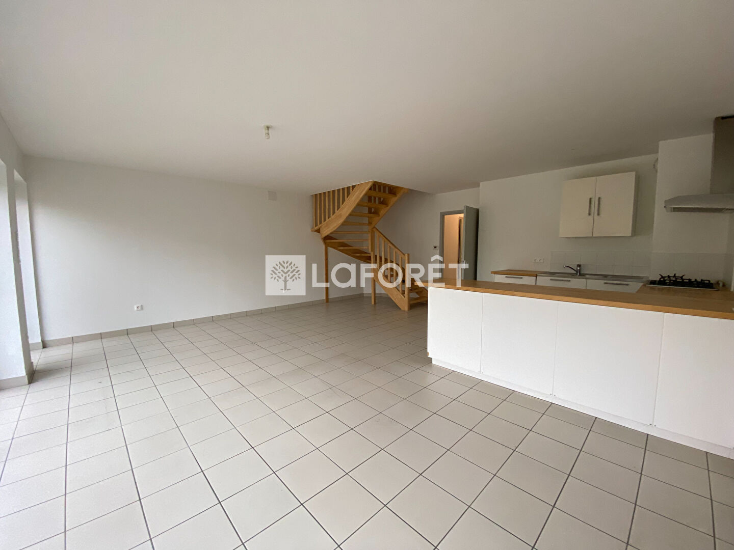 A louer, maison récente avec bonne isolation thermique offrant une entrée, un vestiaire, une cuisine aménagée et équipée d'une hotte, plaque et four ouverte sur le séjour, 3 chambres à l'étage avec placard, une lingerie, salle de bains avec WC, balcon. Cette maison dispose également d'une grande terrasse, d'un terrain clos, d'un garage et d'une place de parking. Chauffage individuel au gaz au sol au rez de chaussée, et radiateurs à l'étage.