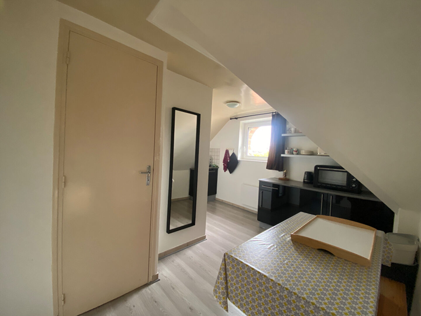 A louer, appartement meublé de type 1BIS comprenant un séjour avec couchage en mezzanine, une cuisine indépendante et une salle de douche avec wc.