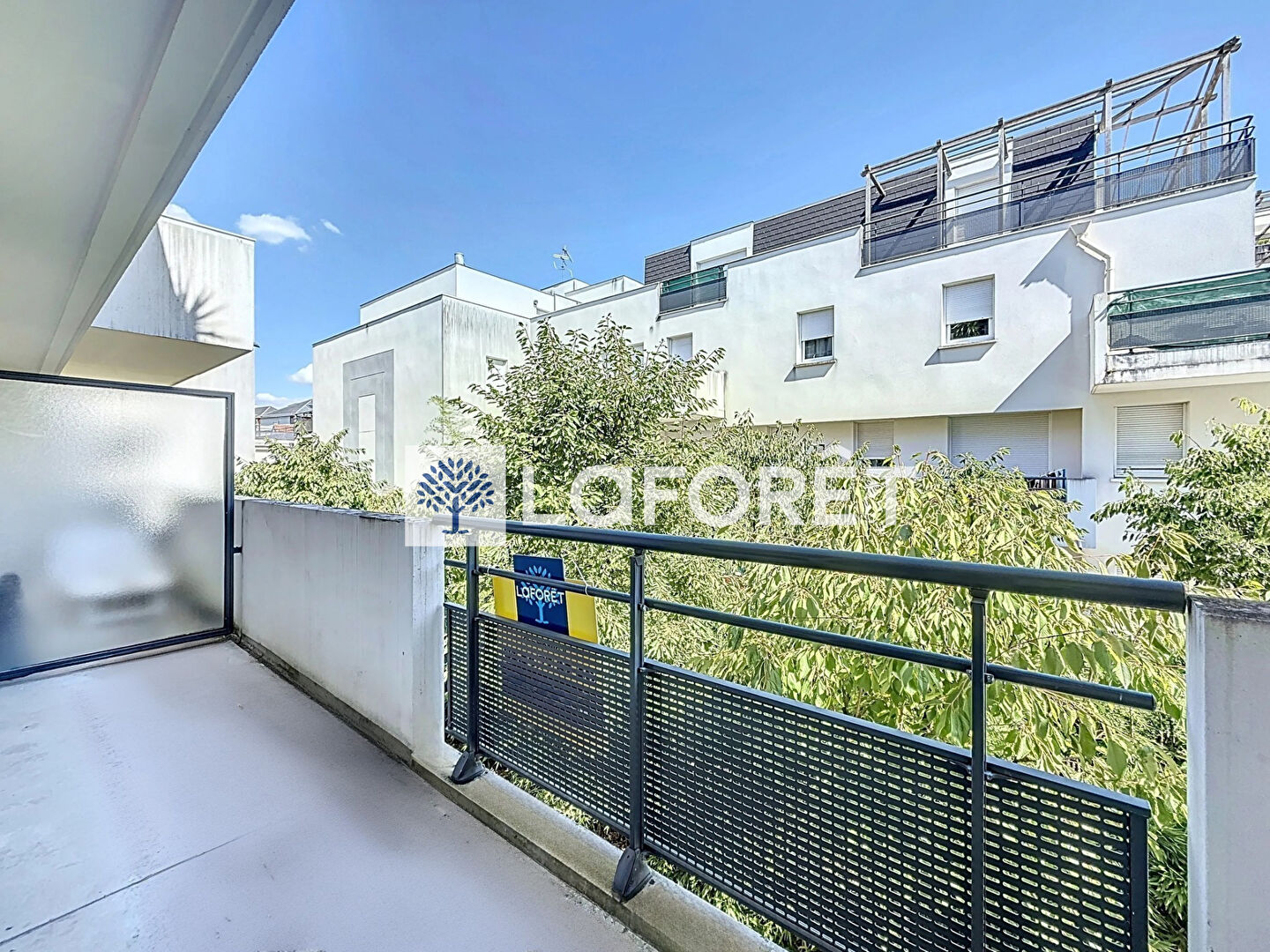 Grand balcon avec vue dégagée sur jardins et piscine.