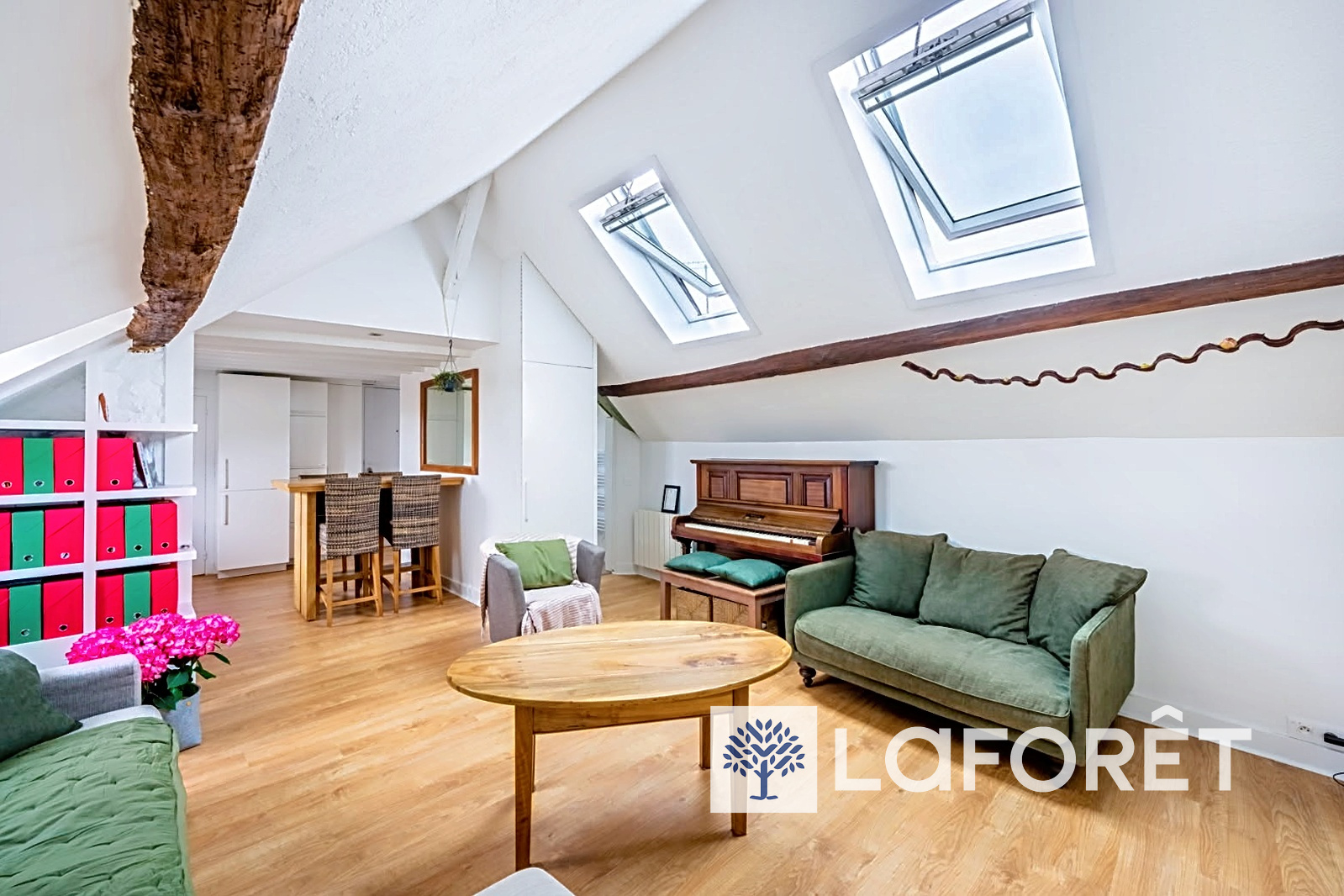 Dès l'entrée, le charme opère. En parfait état, l'appartement se compose d'une cuisine entièrement équipée, d'un séjour baigné de lumière offrant une vue dégagée, d'une grande chambre sous combles au cachet indéniable, d'un bureau pouvant faire office de chambre, d'une salle de douche et de toilettes séparées.