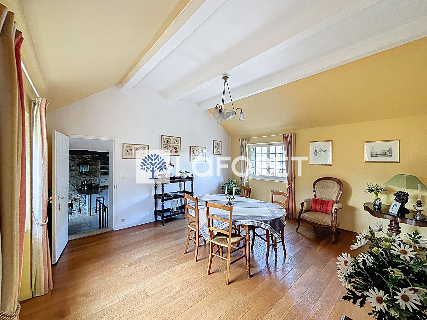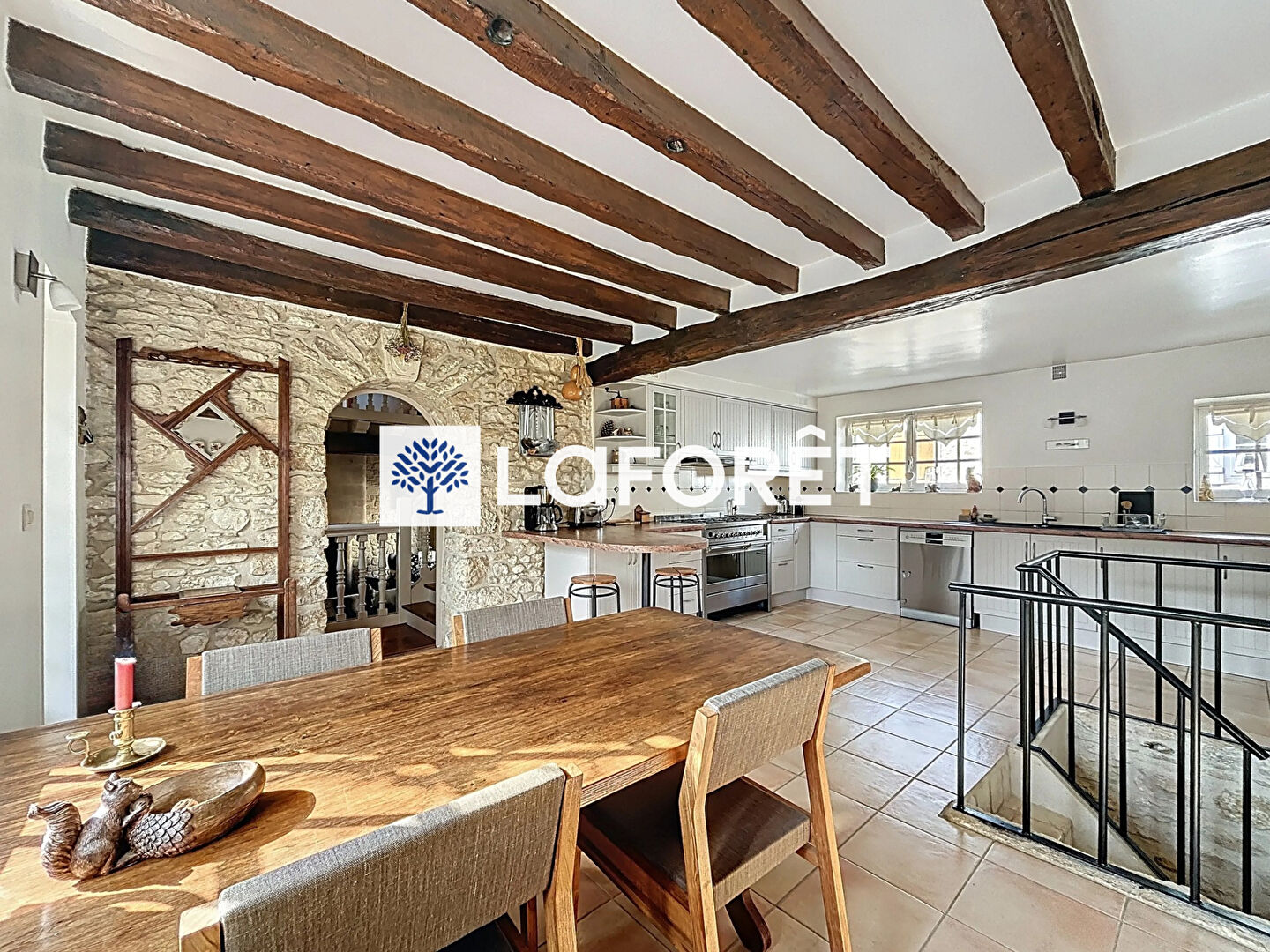 Offrant un cadre de vie paisible et empreint d'authenticité, elle séduira les amateurs de vieilles pierres et de tranquillité. L'entrée s'effectue par une spacieuse cuisine dinatoire entièrement équipée, prolongée par une terrasse conviviale.