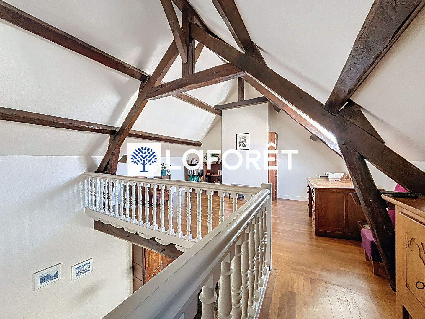 La pièce de réception de 40 m², au plafond cathédrale impressionne par ses volumes généreux, sa cheminée monumentale et ses poutres apparentes. Une grande mezzanine surplombe cet espace et propose un bureau ouvert, facilement transformable en espace détente ou family-room.