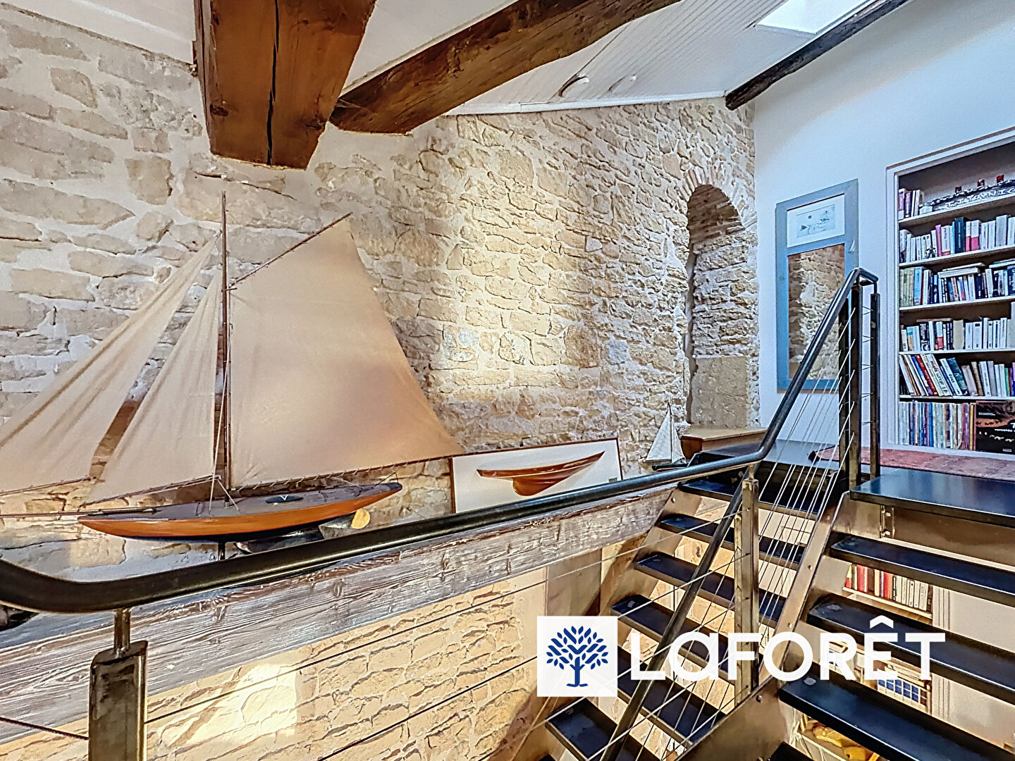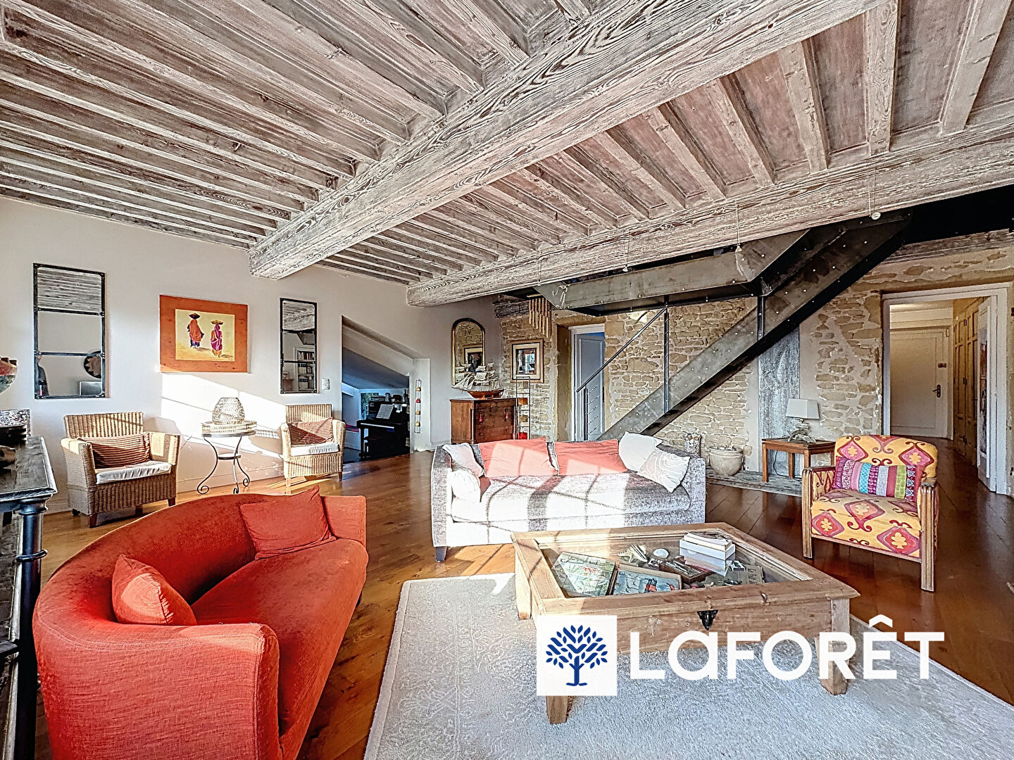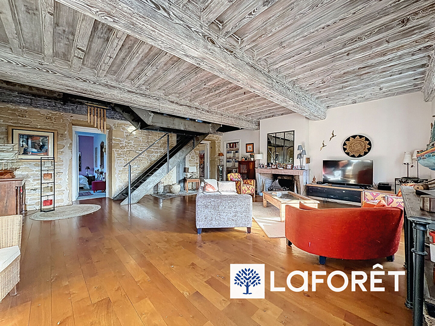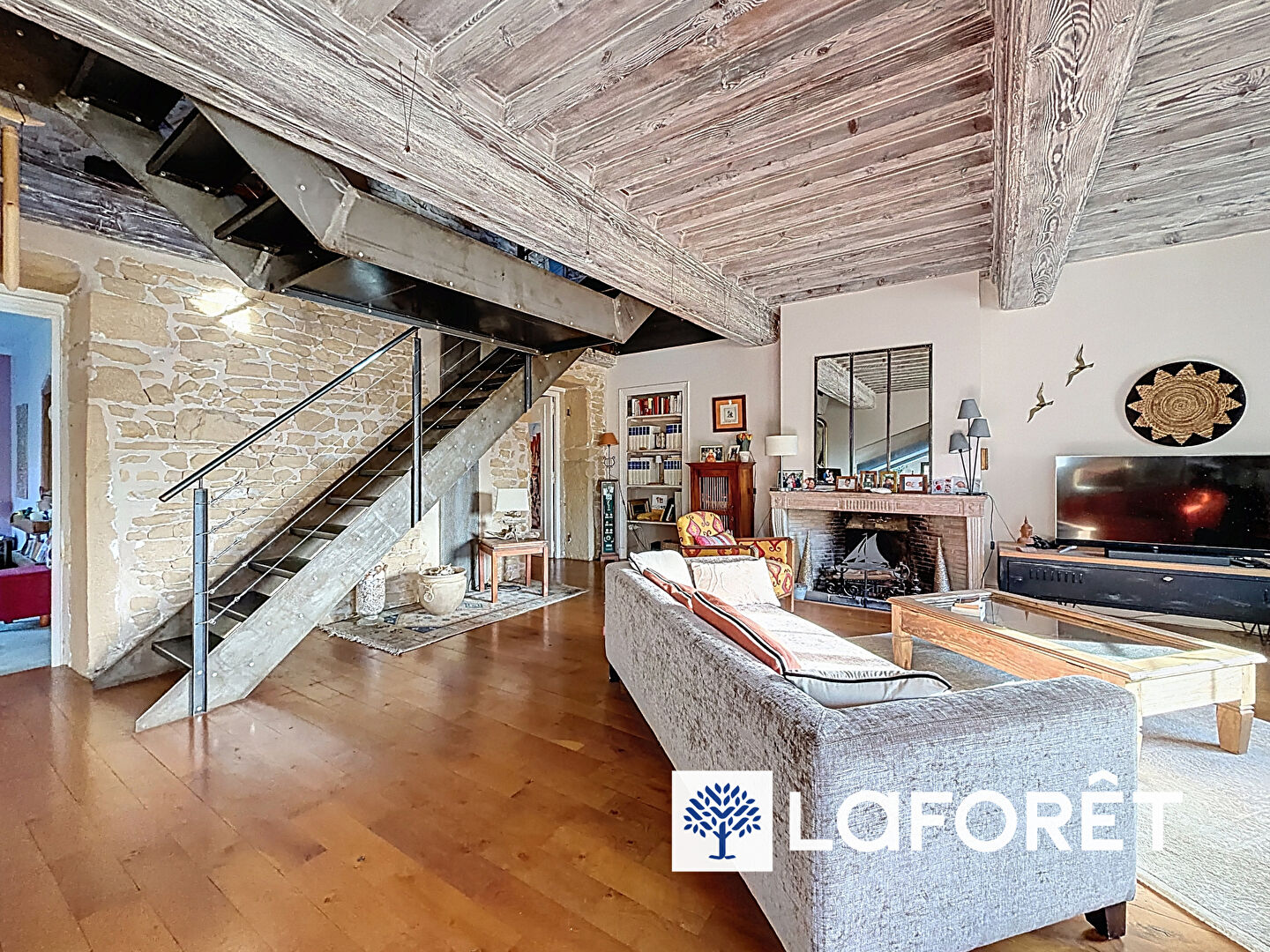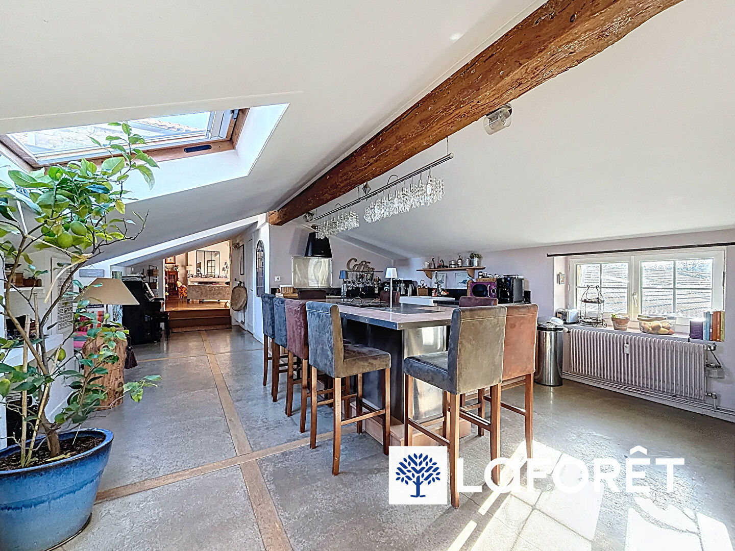 Cet appartement atypique propose une pièce de vie conviviale et lumineuse, mettant en valeur de matériaux nobles tels que la pierre et le bois, qui créent une atmosphère à la fois élégante et chaleureuse.