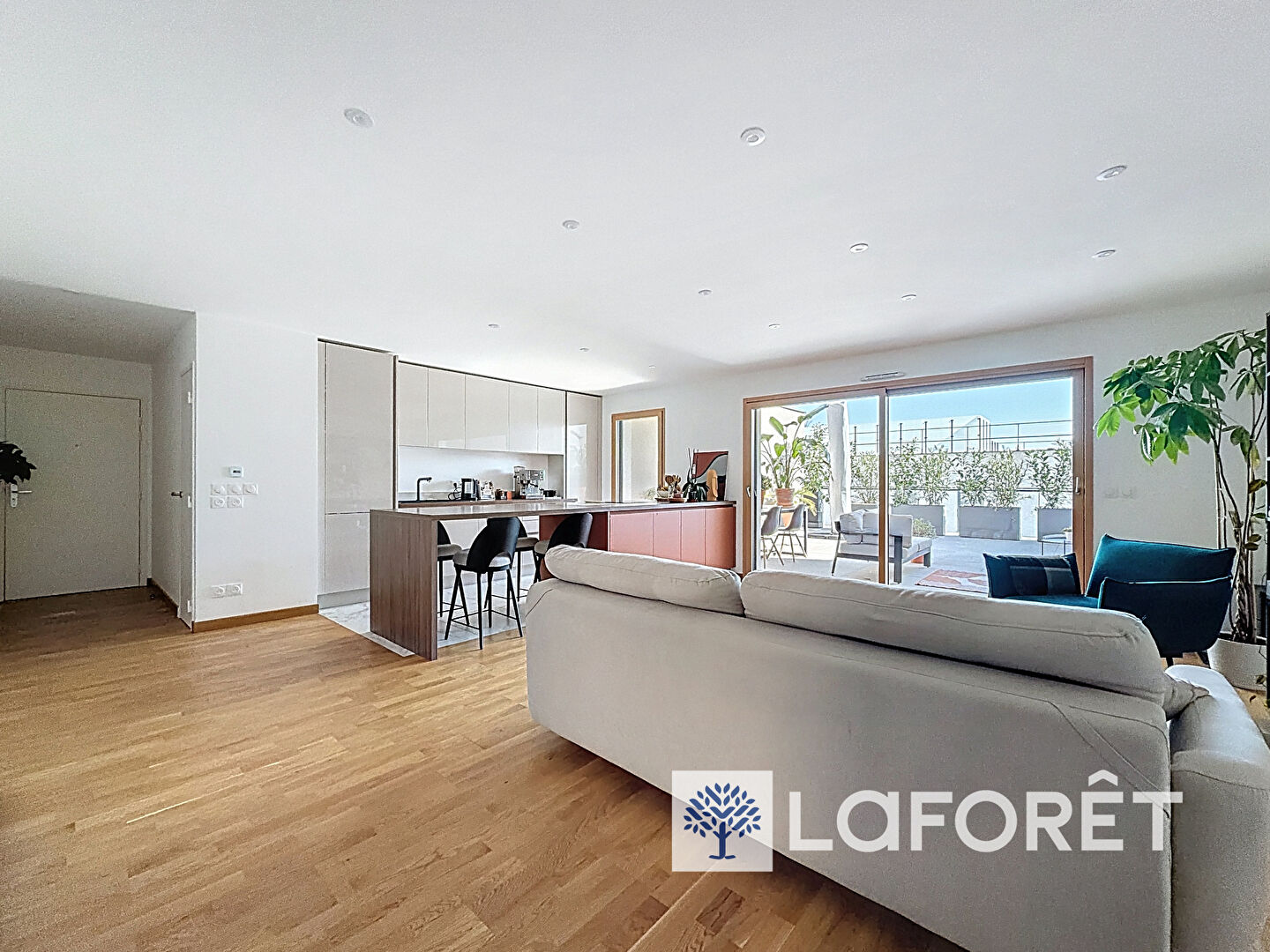 Le séjour se prolonge naturellement par une exceptionnelle terrasse de 58 m², véritable pièce supplémentaire.