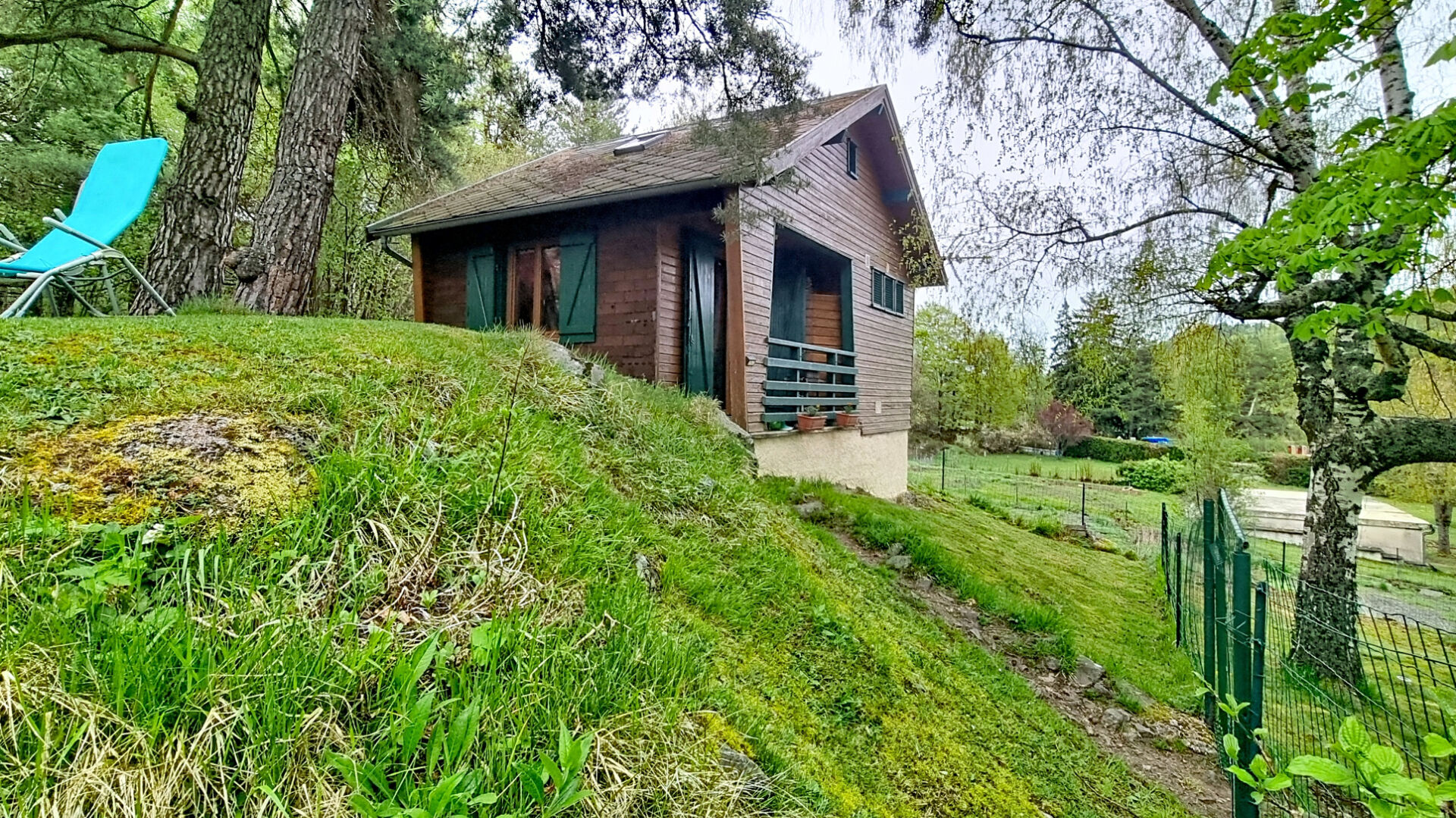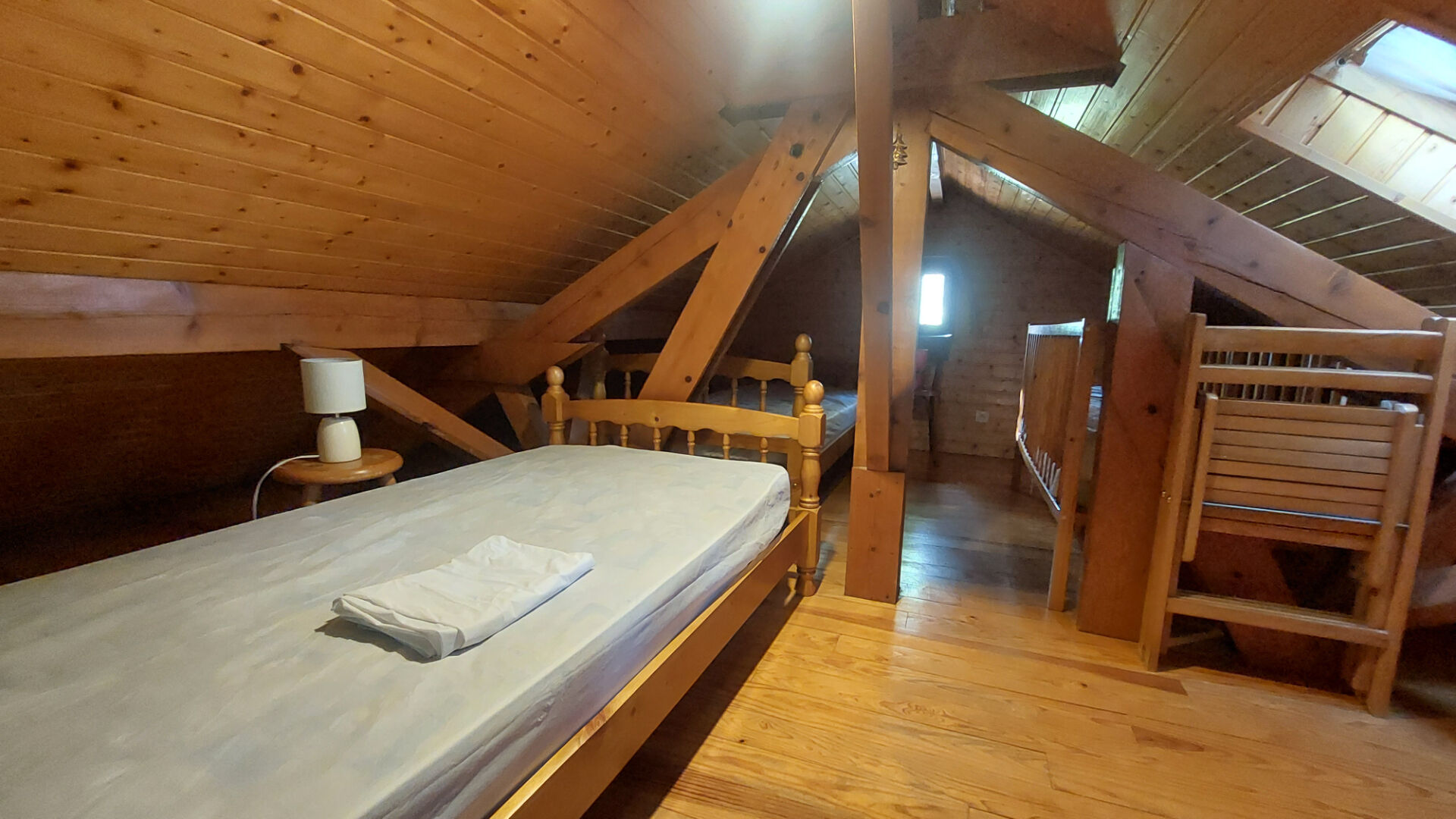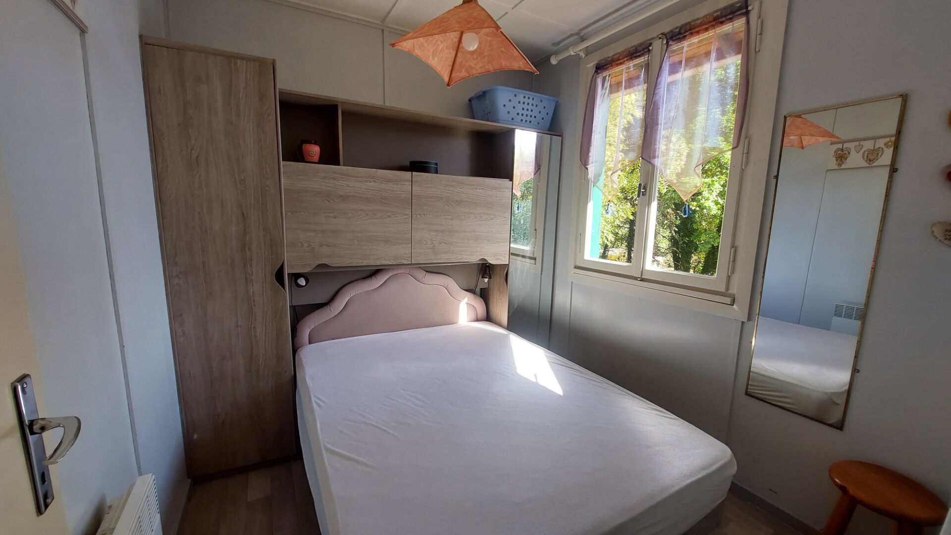 Et un chalet avec petit terrain privatif de moins de 30m2 comprenant : pièce de vie, kitchenette, chambre, salle d'eau et WC, et en mezzanine, un dortoir pour enfants.