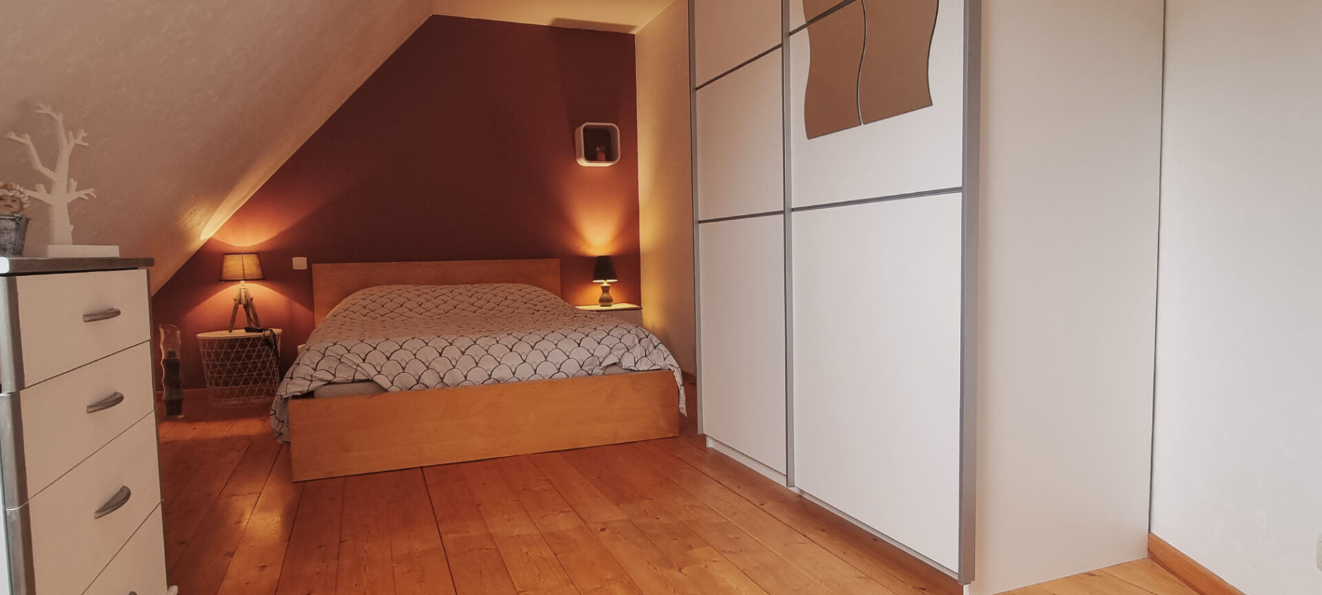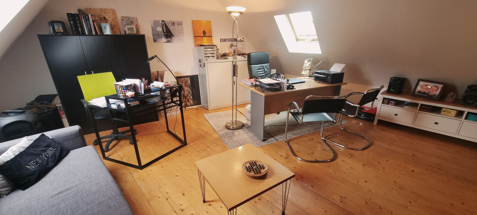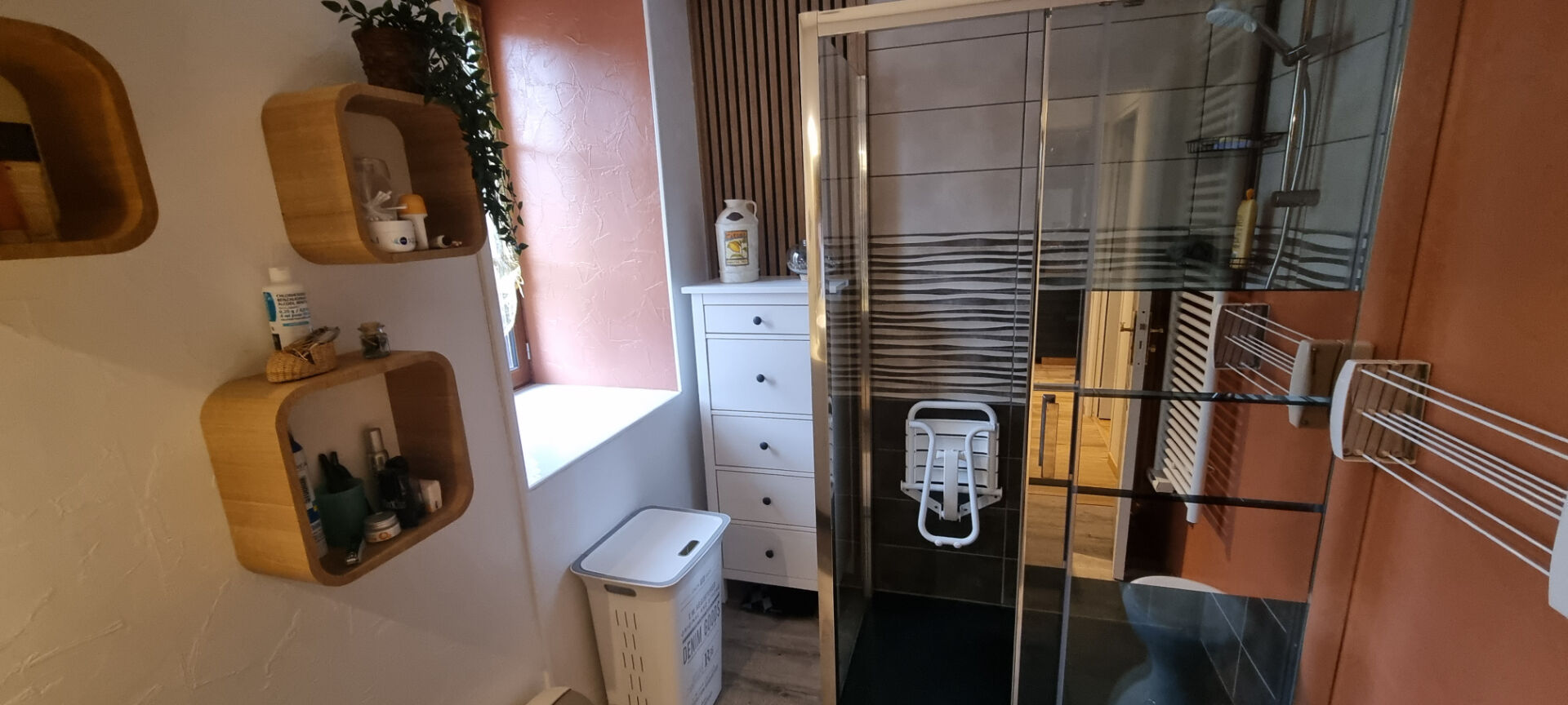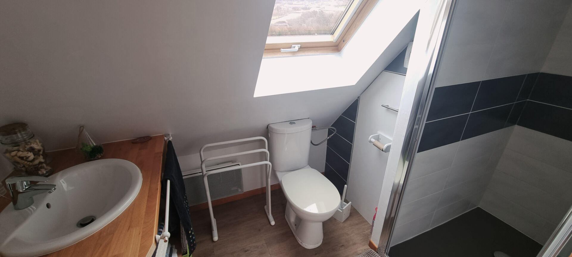 Au 1er étage : une salle d'eau avec WC, deux chambres de 16m2 et 25 m2 environ (surface au sol, car mansardées) et un coin lecture.