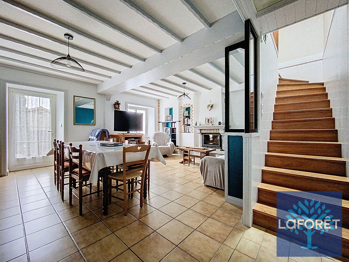 Au rez-de-chaussée, vous découvrirez une cuisine aménagée/équipée, un salon/salle à manger avec cheminée, ainsi que deux chambres et un WC.