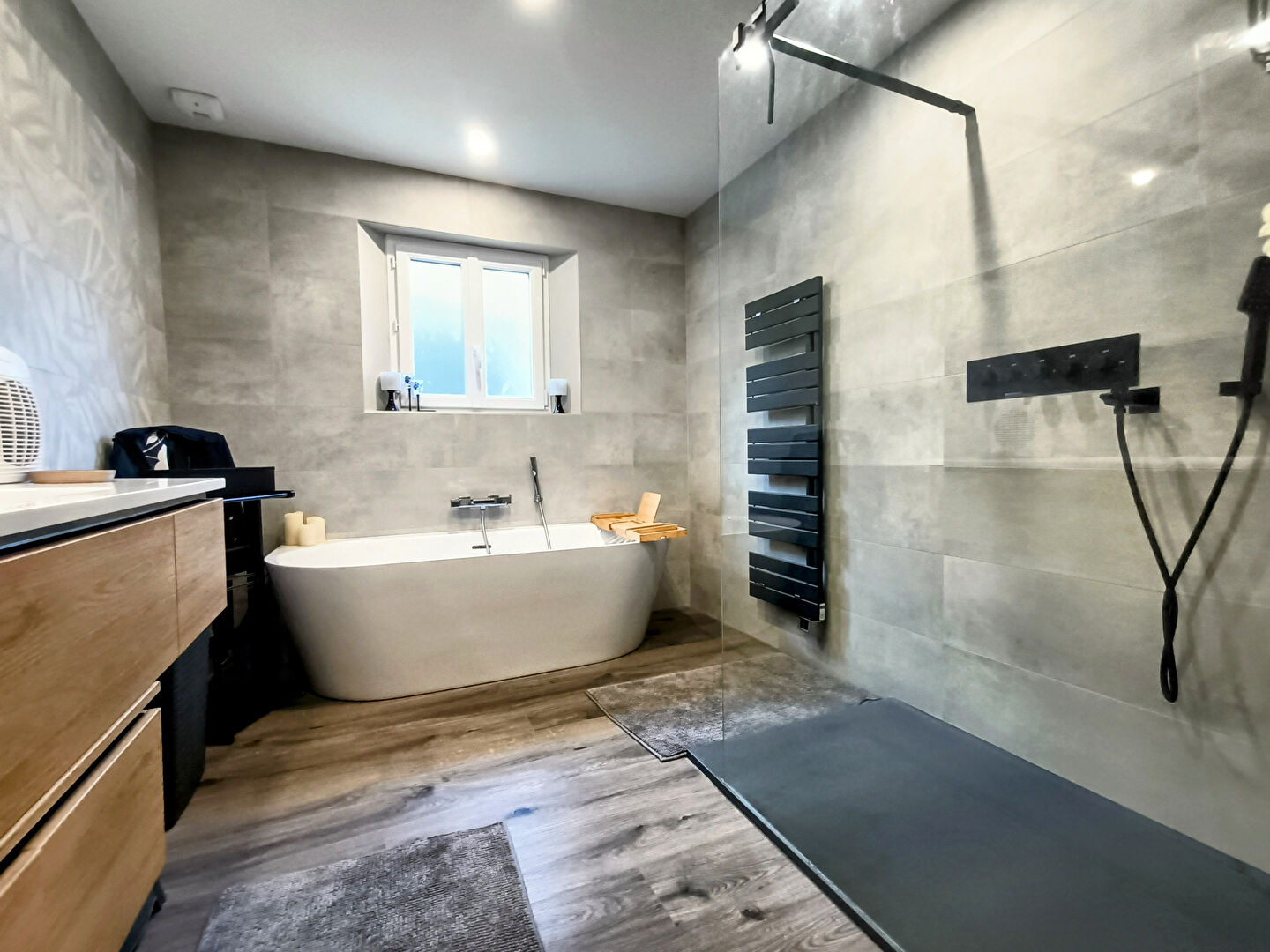 Vous y trouverez également une grande chambre de 21 m², une buanderie, une salle de bain avec baignoire et douche, ainsi qu'un WC séparé.
