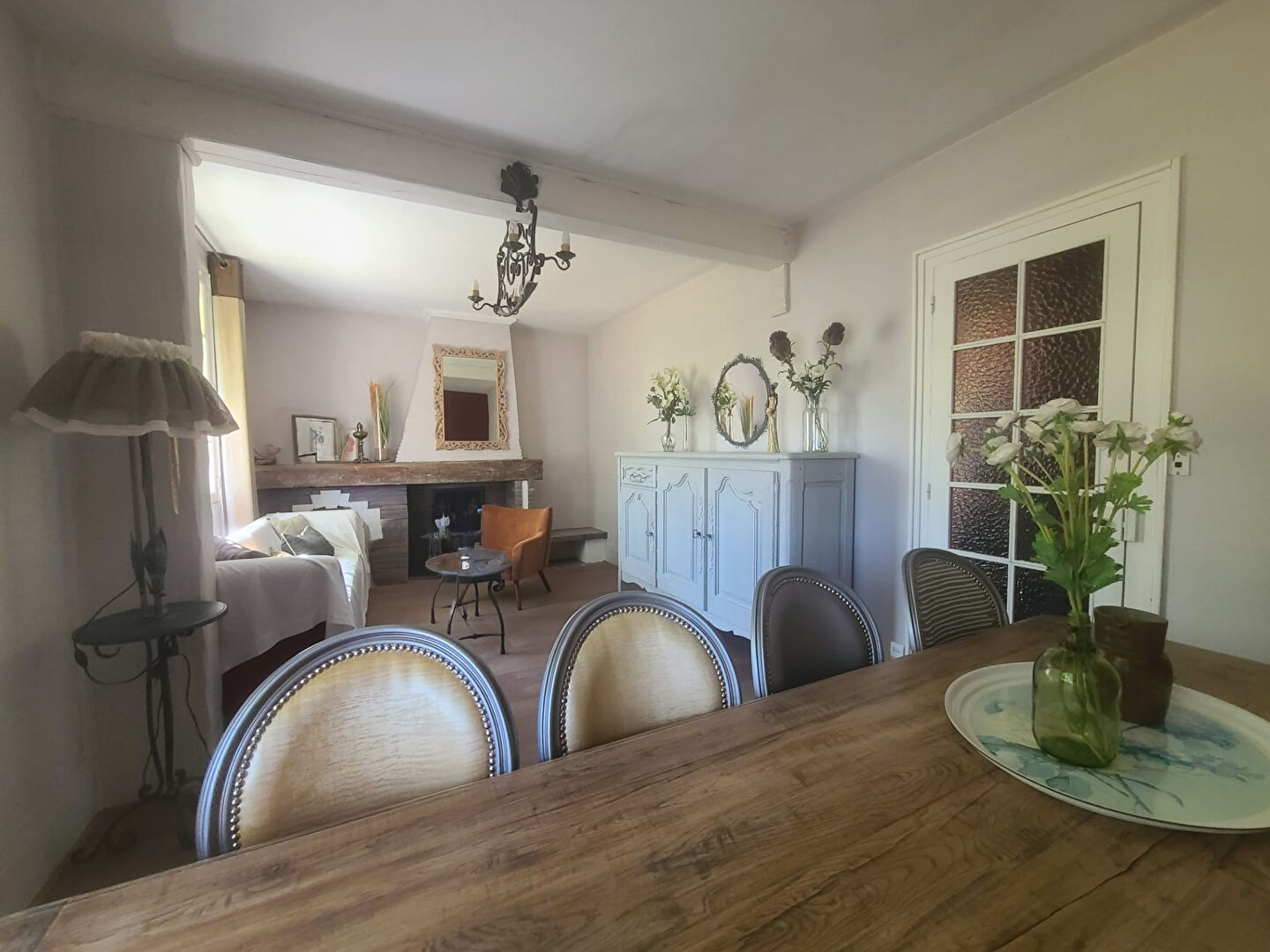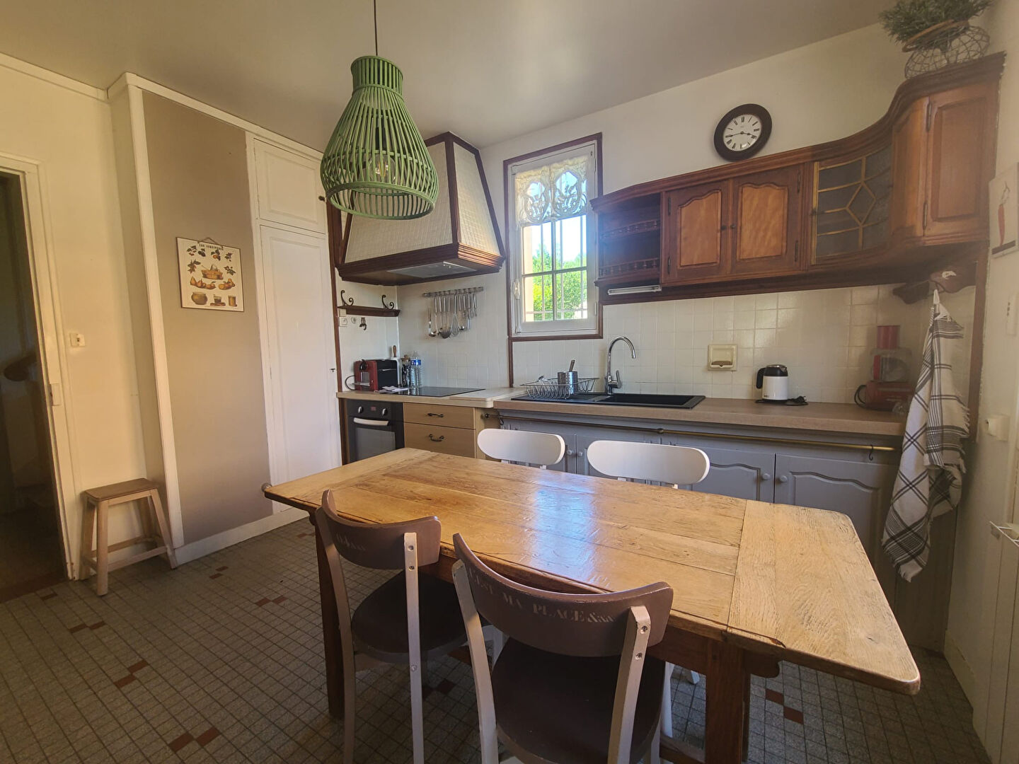 Le rez-de-chaussée accueille une entrée fonctionnelle, une cuisine indépendante aménagée et équipée charme rétro, un salon-séjour, une chambre avec rangements intégrés, ainsi que des WC séparés.