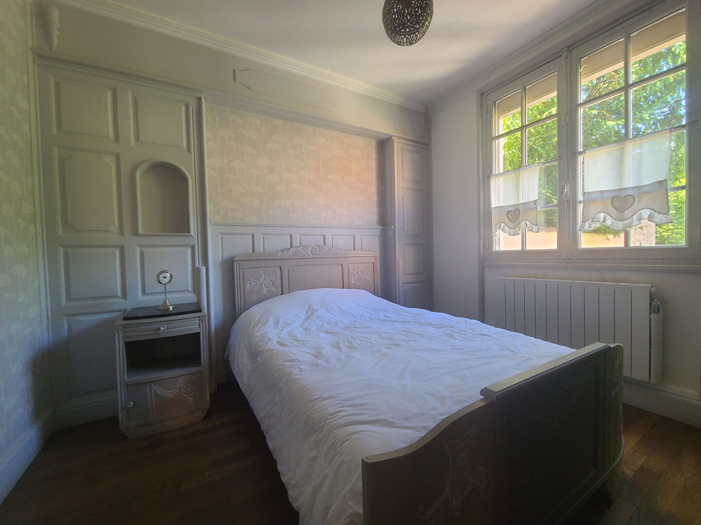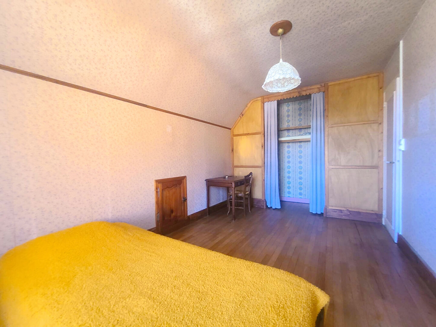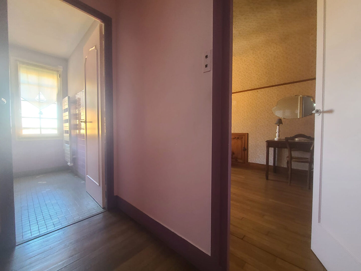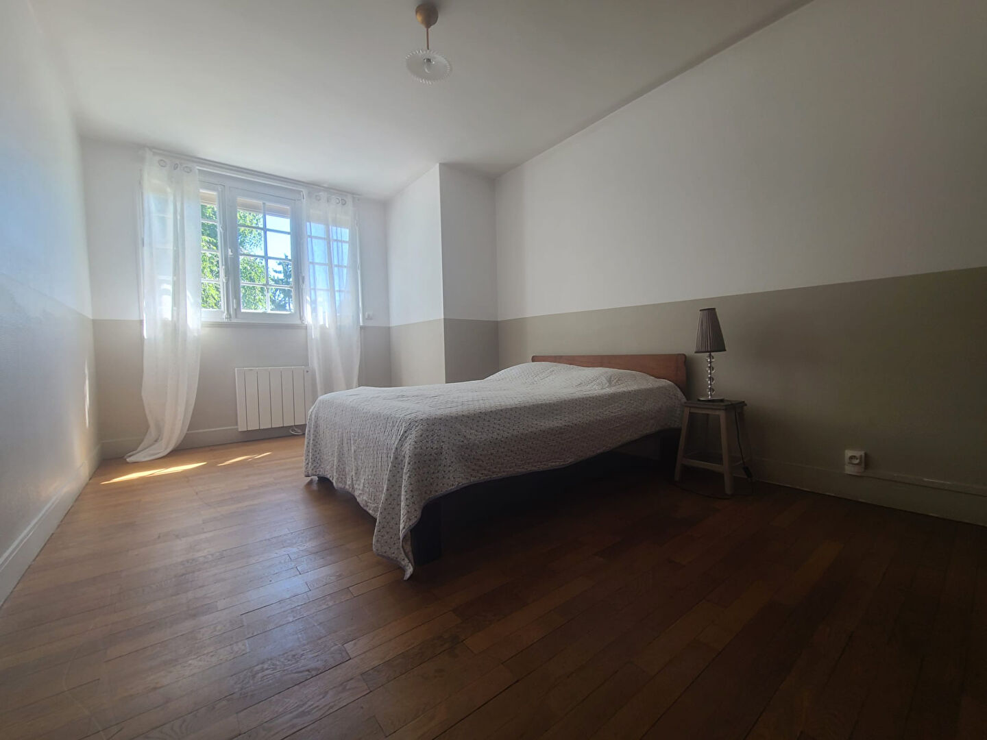 À l'étage, un palier distribue deux chambres chaleureuses dotées de beaux parquets en bois massif, une salle de bains et des WC indépendants.