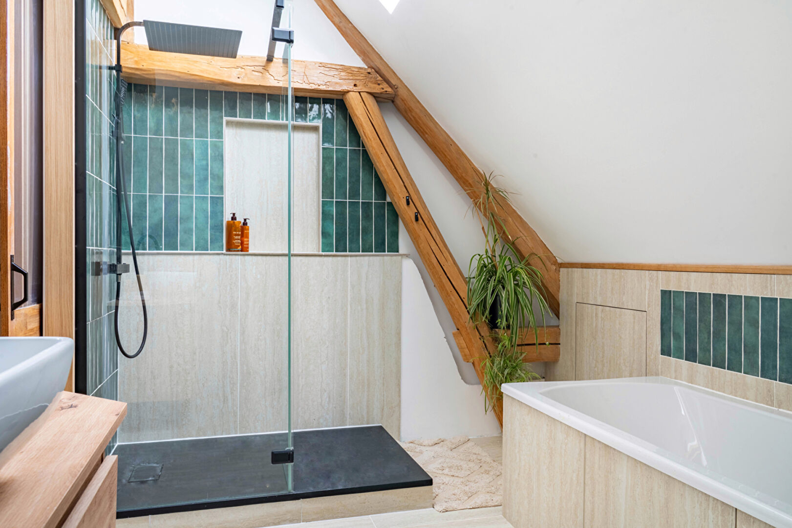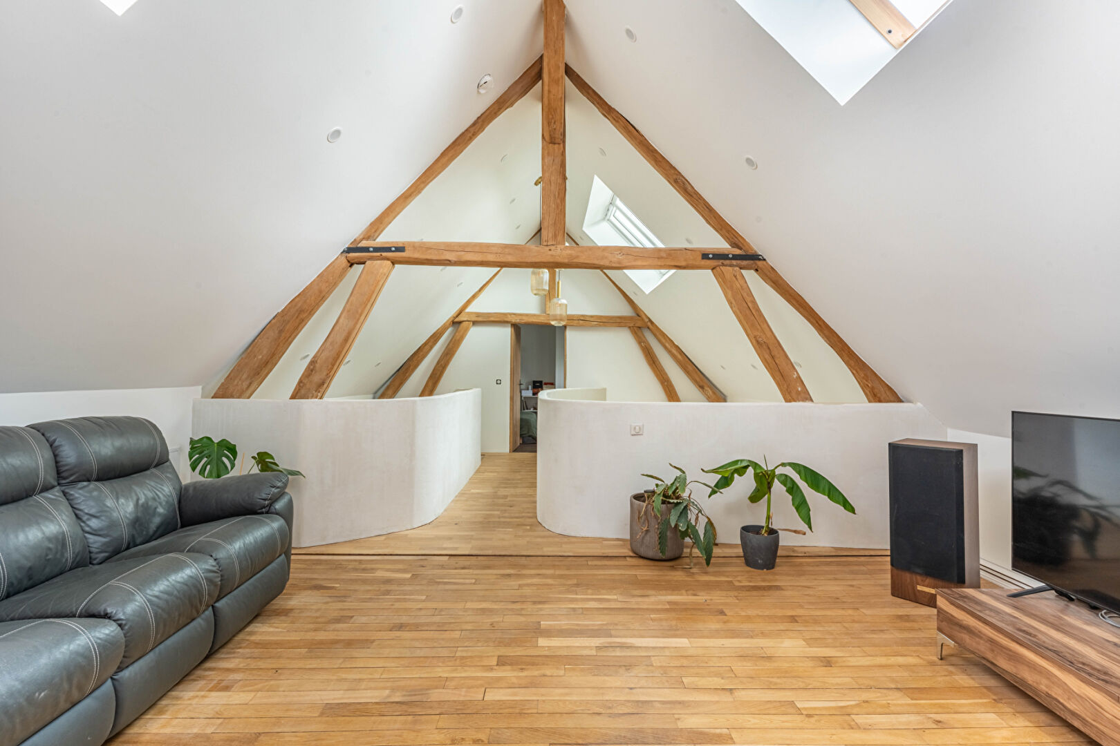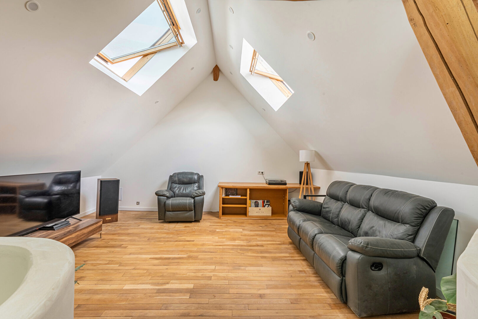 Le vaste salon, baigné de lumière et sublimé par son toit cathédrale, offre une atmosphère à la fois chaleureuse et conviviale. Il s'ouvre sur une cuisine moderne et élégante, pensée pour partager de beaux moments en famille ou entre amis.