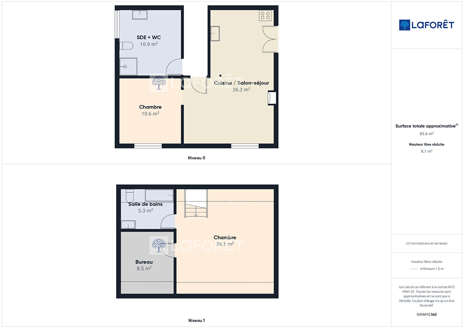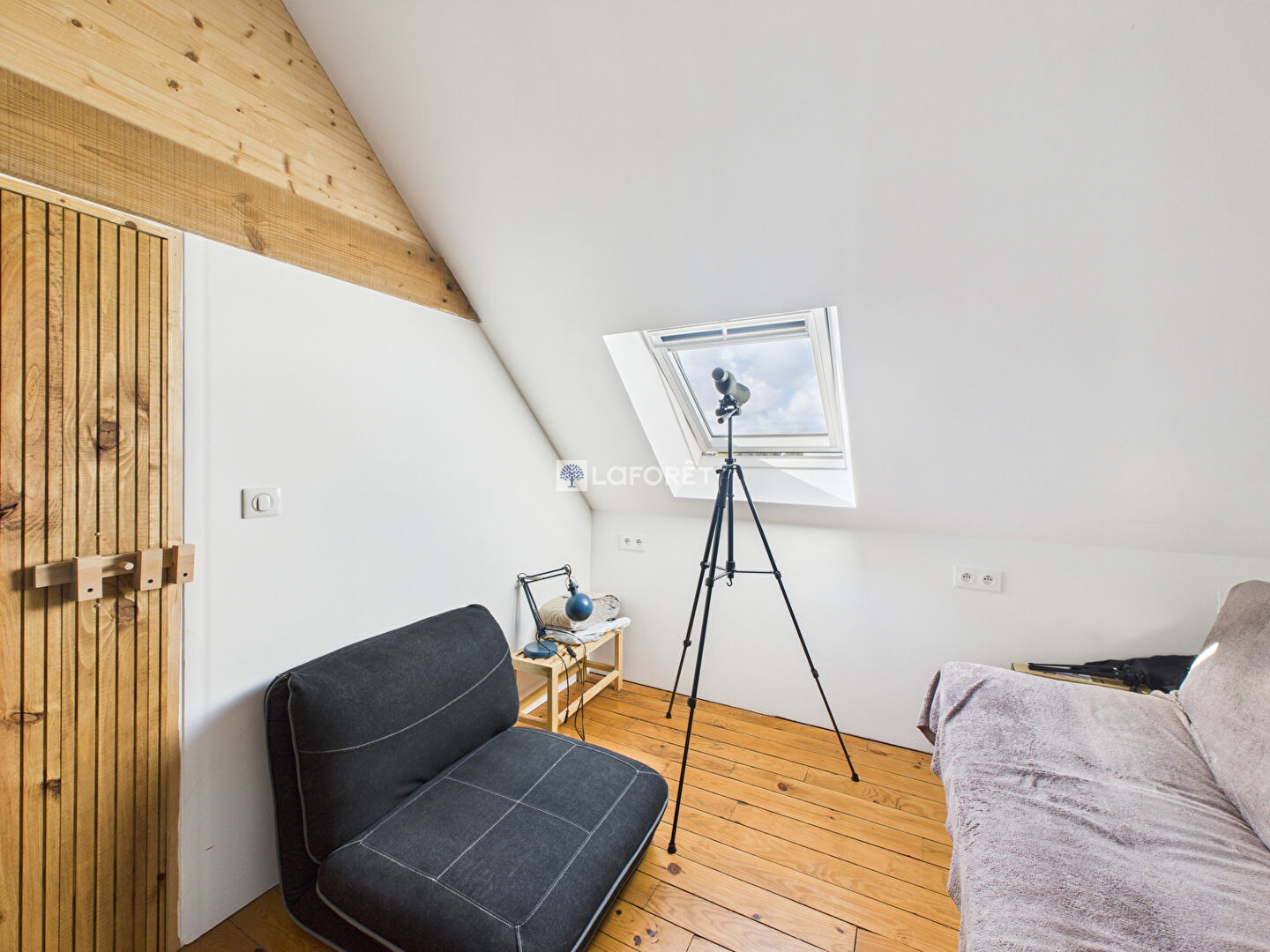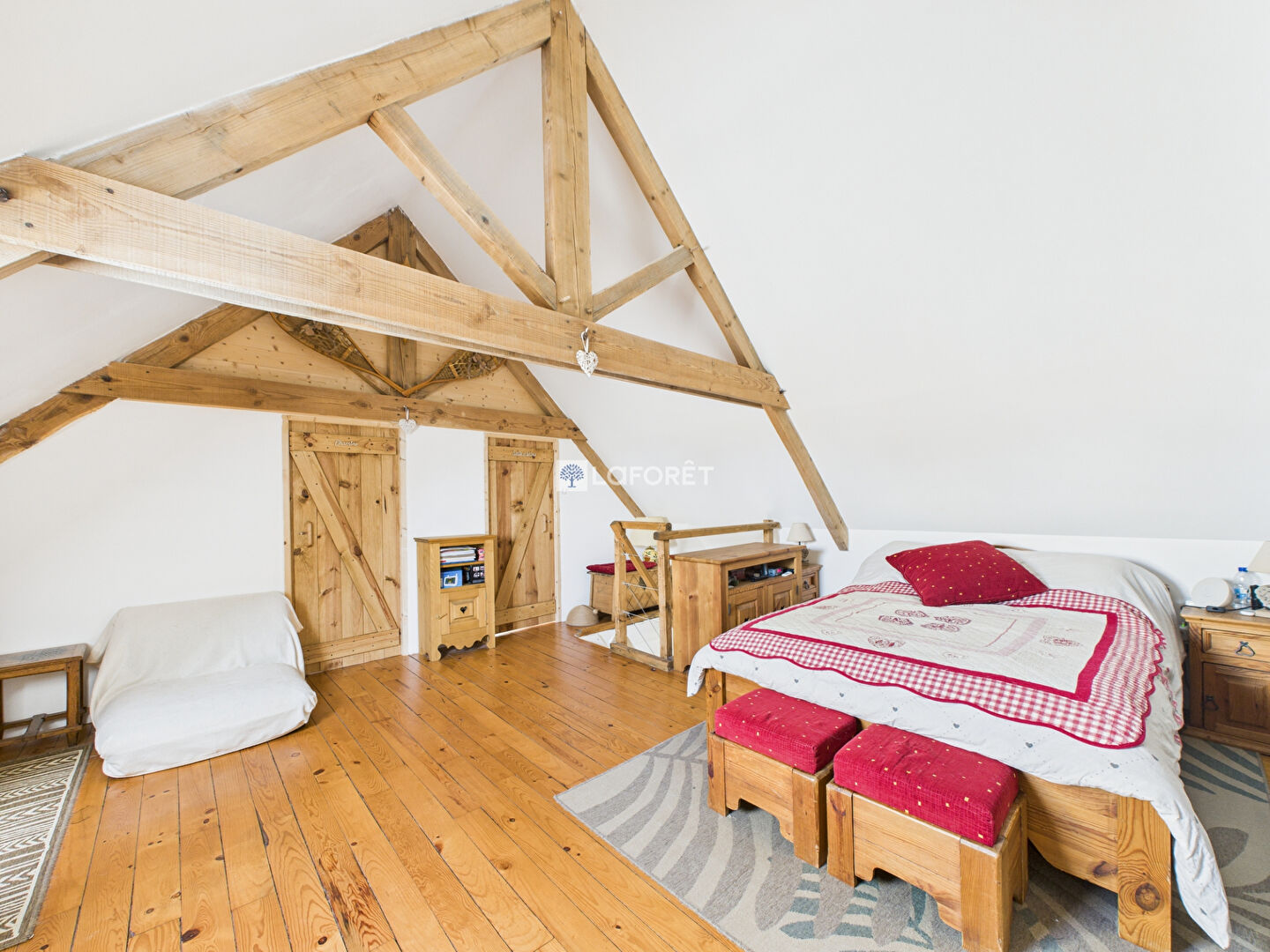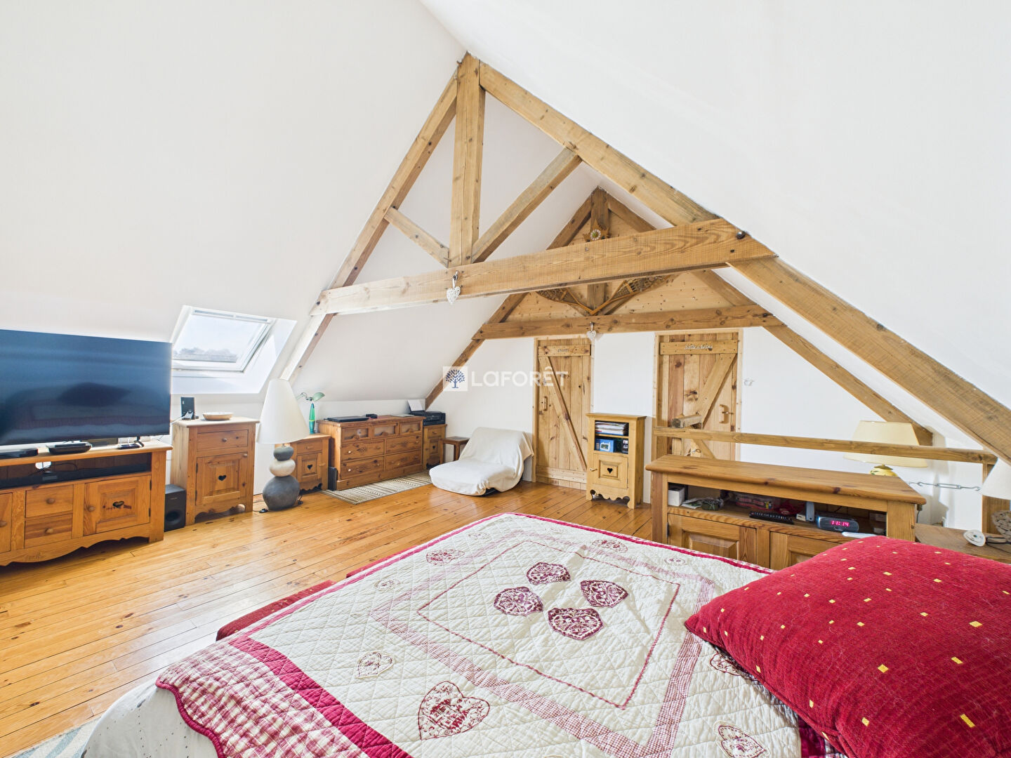 À l'étage : une grande chambre, un bureau et une salle de bains élégante avec WC.
