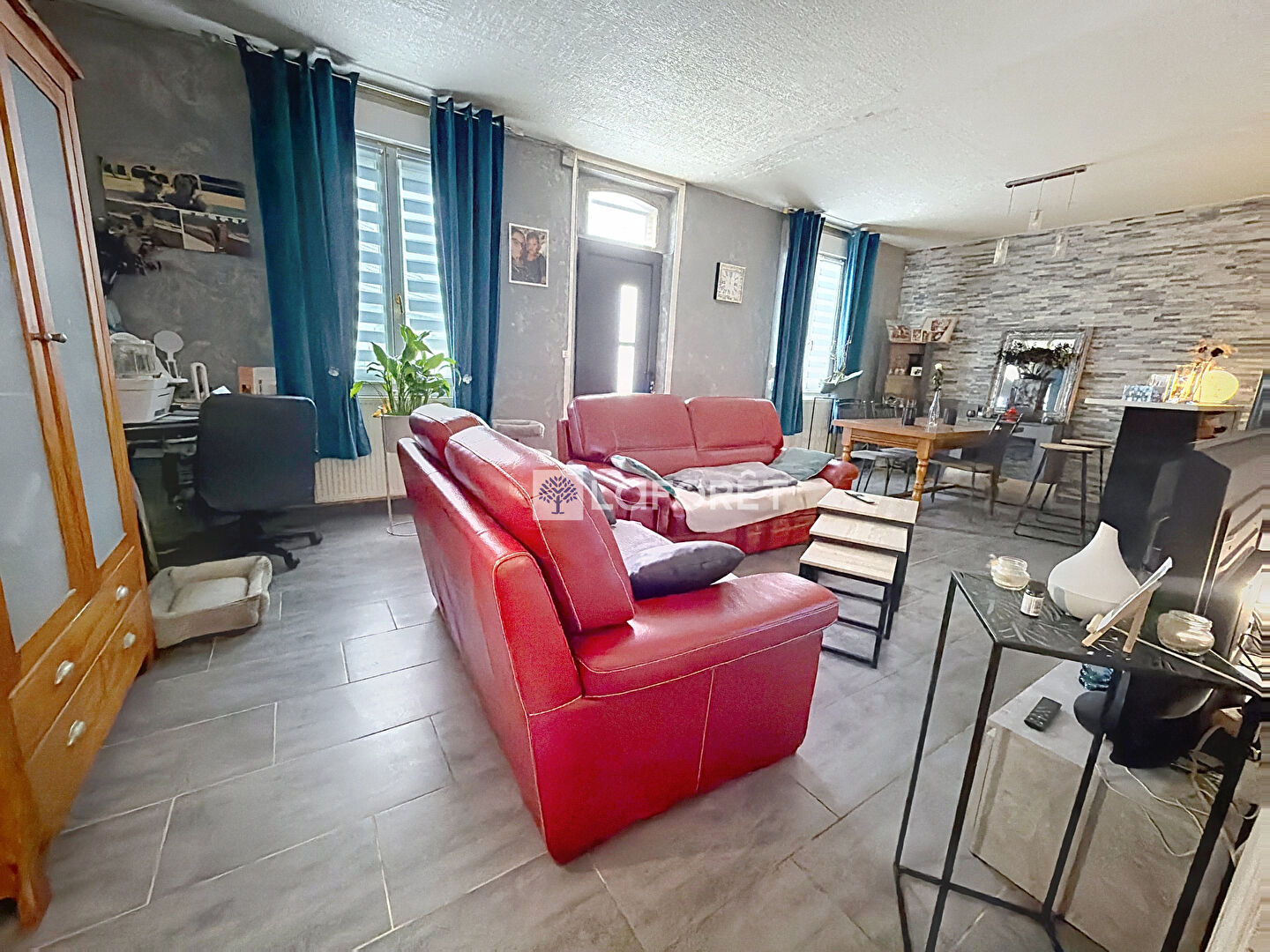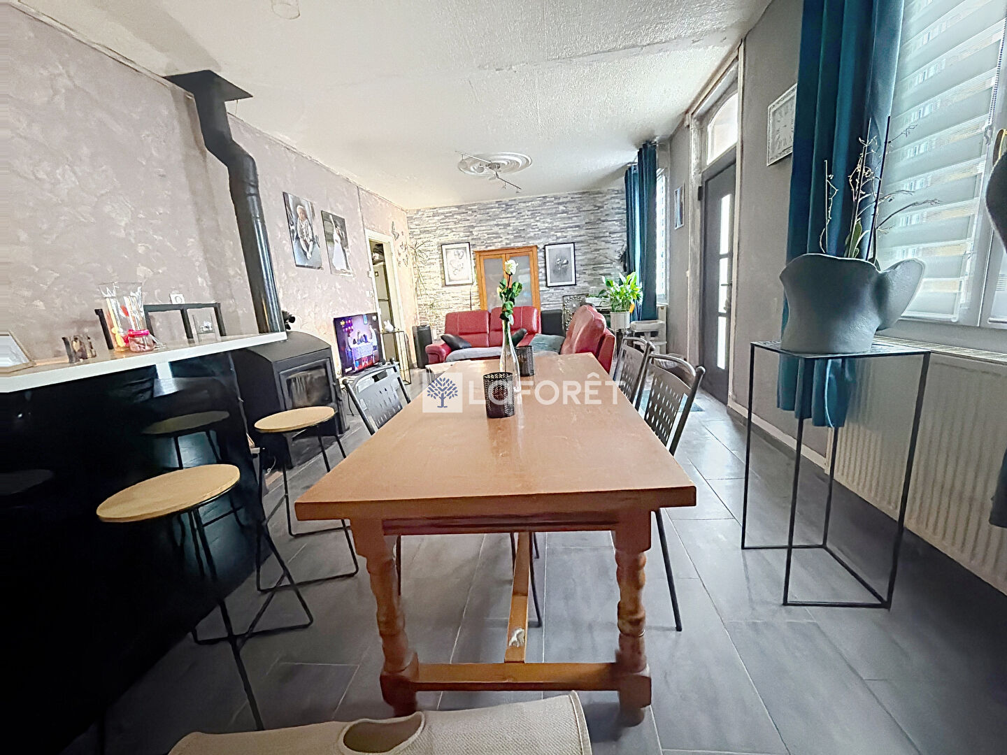 Au rez-de-chaussée, vous trouverez un séjour lumineux de plus de 30 m² avec poêle à bois, une cuisine équipée, une chambre, une salle de bain et une véranda.