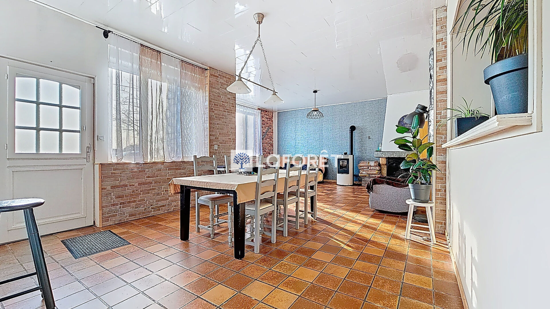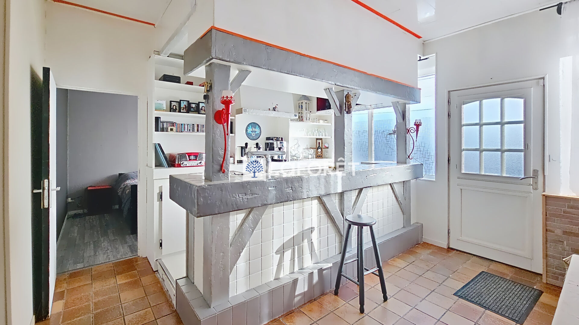 Cette habitation offre la possibilité de vivre entièrement de plain-pied. Vous serez séduits par sa vaste pièce de vie d'environ 50 m², qui conserve l'authenticité du lieu grâce à son bar d'origine, rappelant l'âme conviviale de l'ancien établissement. La cuisine équipée semi-ouverte vient compléter cet espace.