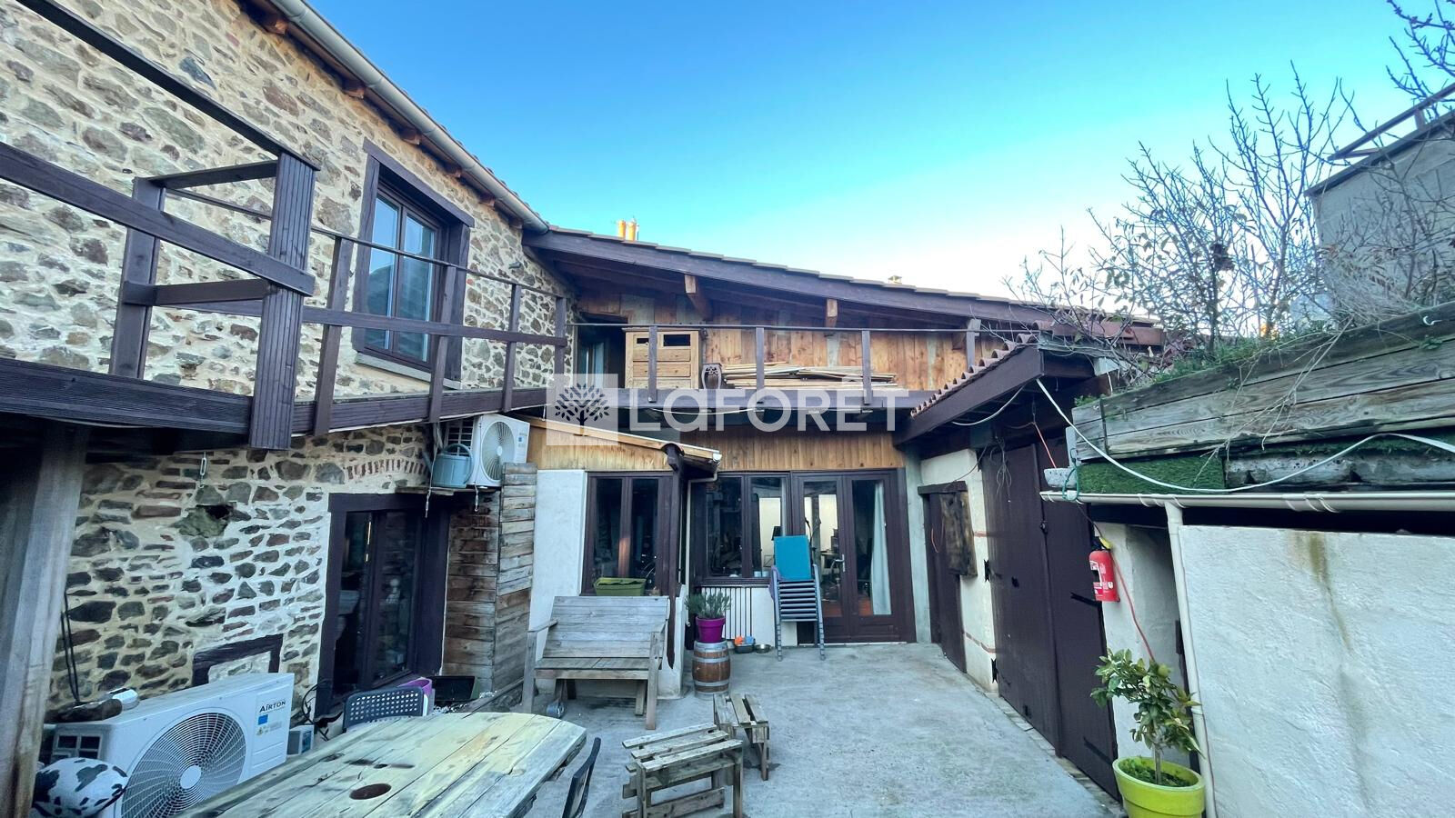 Prox Chazelles sur Lyon. Située au coeur du village, cette grande maison en pierre de 225 m² habitables, avec une cour aménagée, offre des pièces de vie charmantes avec des volumes atypiques. Vous y découvrirez une cuisine équipée, un séjour spacieux avec poêle à granulés, un salon cosy , une grande mezzanine et 5 chambres. En rez-de-chaussée, un T2 indépendant, ainsi qu'un espace offrant de nombreuses possibilités (location, profession libérale), vient compléter l'ensemble. Pour plus de confort, la maison dispose également d'une climatisation réversible.