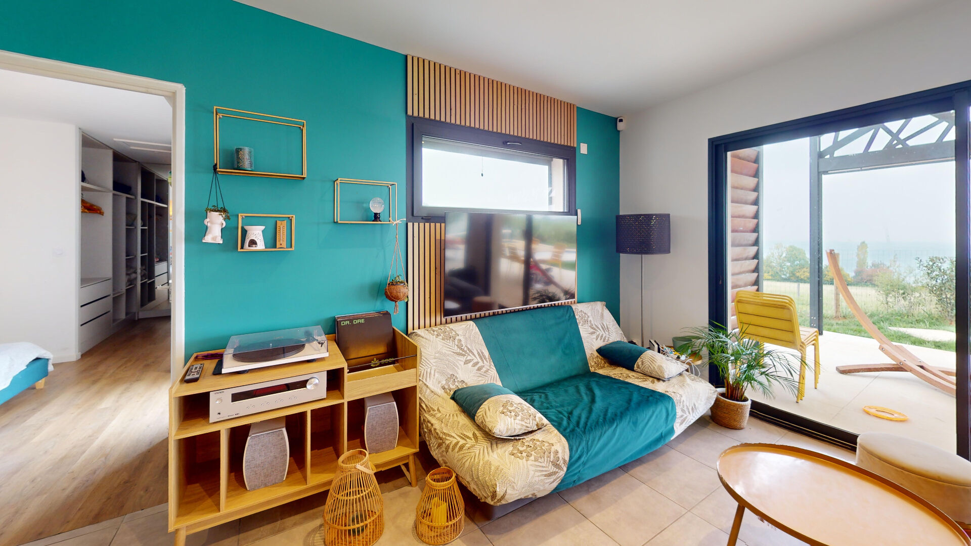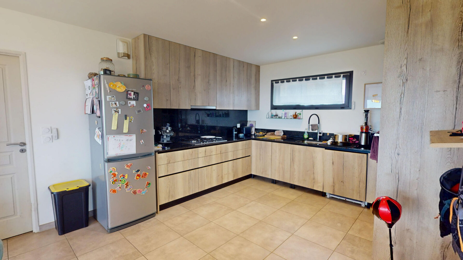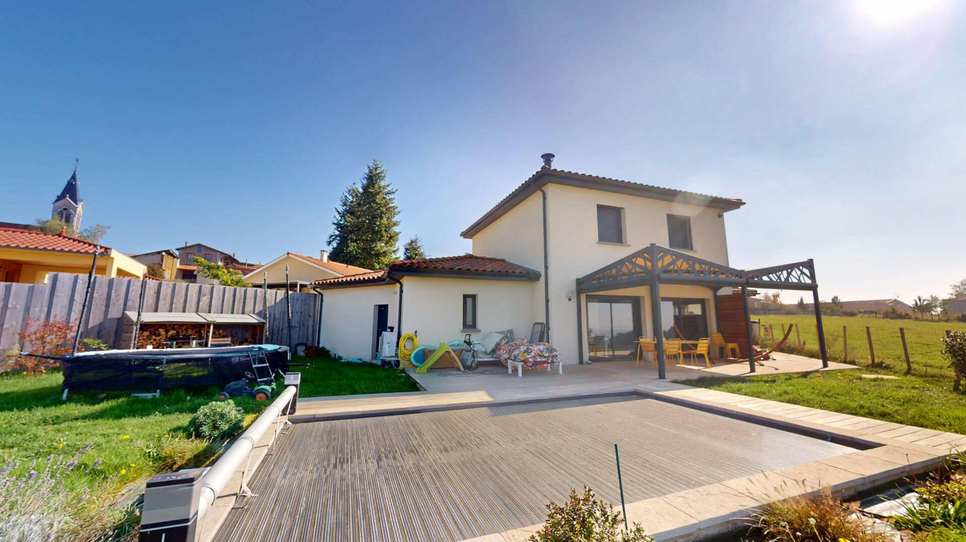 Elle se compose d'une vaste pièce de vie avec cuisine ouverte donnant sur la terrasse et la piscine, de trois chambres et une suite parentale avec salle d'eau privative et dressing, d'une buanderie et d'un grand garage.