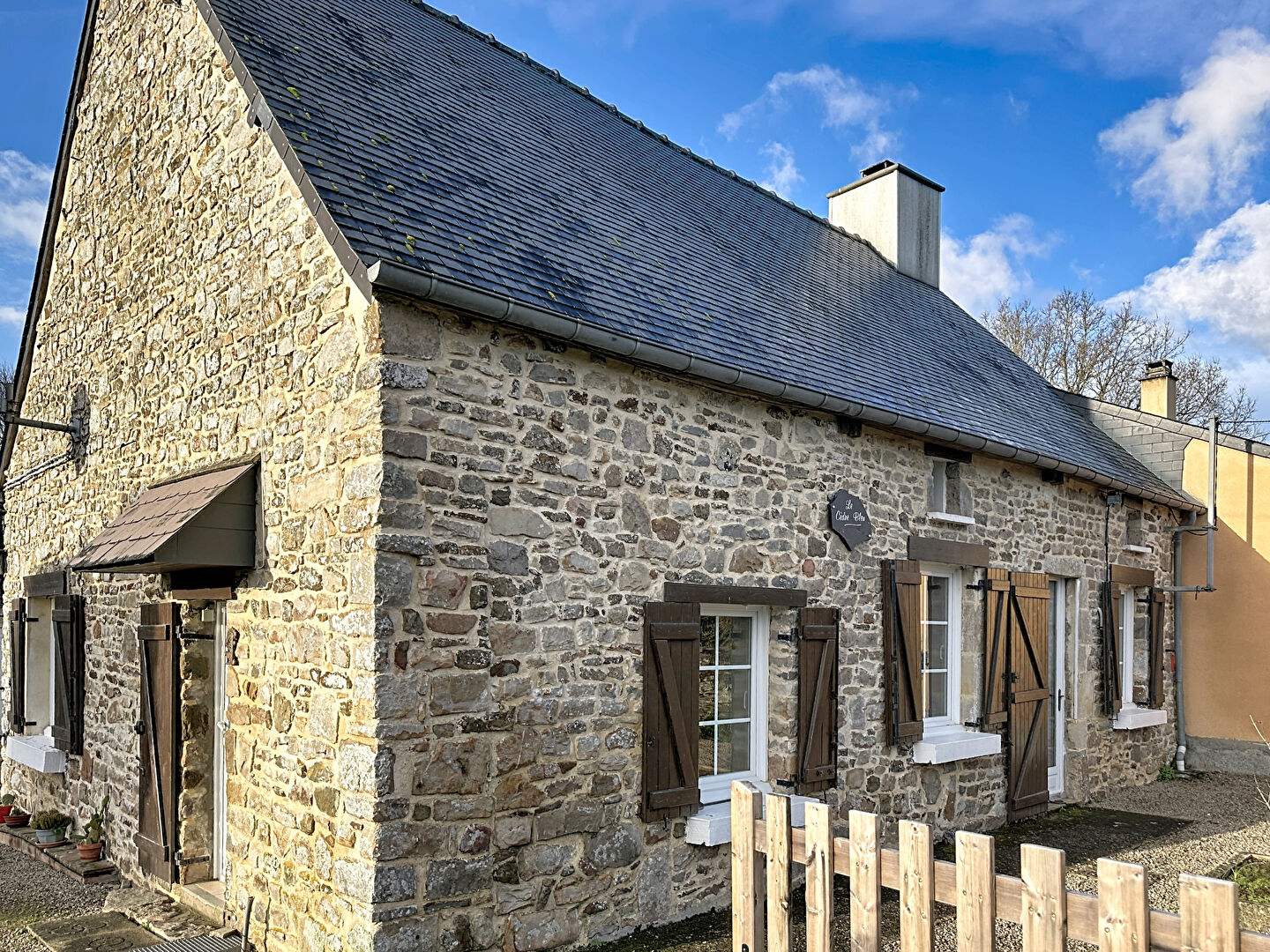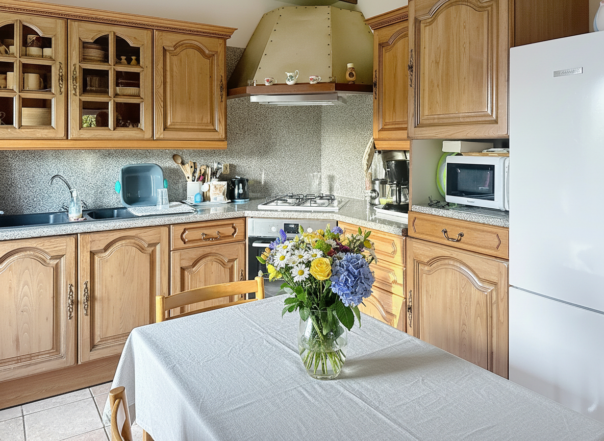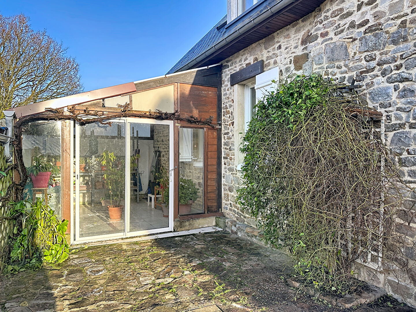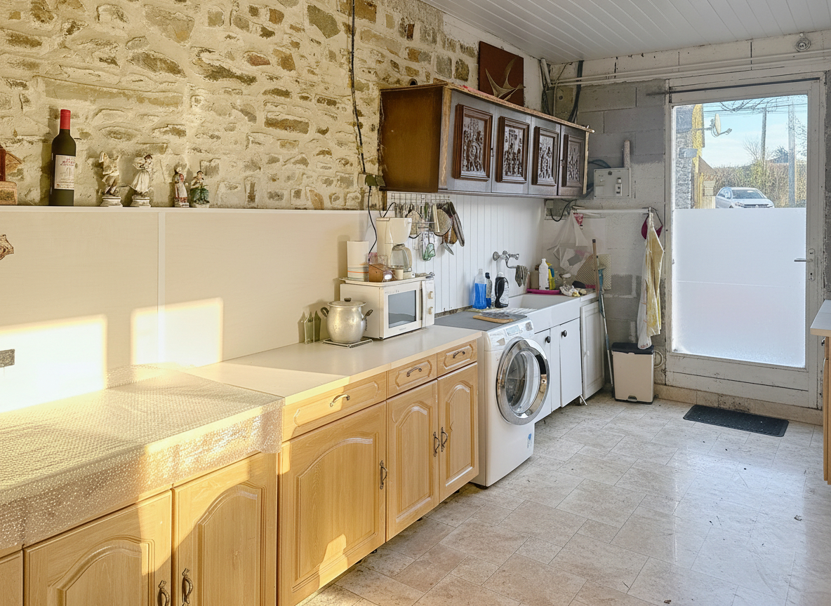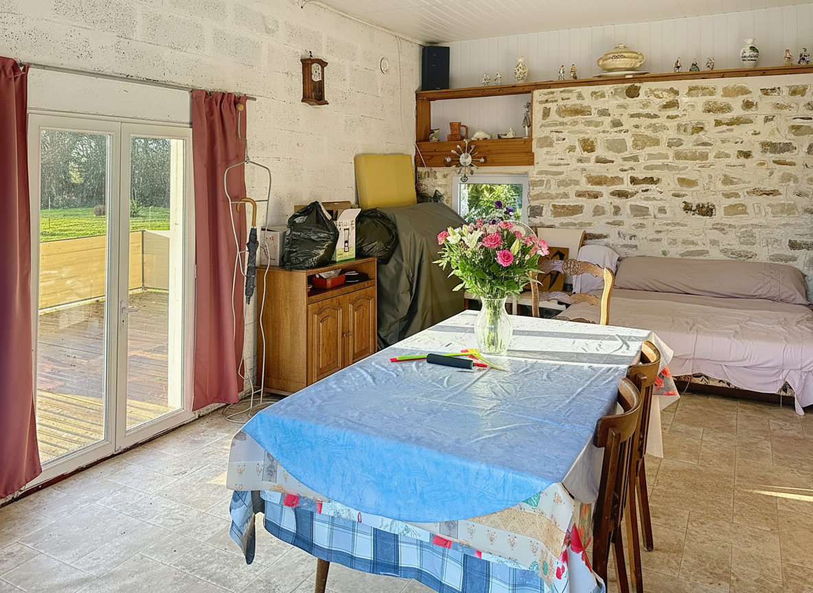 La maison accolée d'un coté offre 98 m² habitables et se compose au rez-de-chaussée d'une cuisine, d'un salon-séjour, ainsi que d'une chambre avec salle d'eau et WC, permettant une vie de plain-pied.