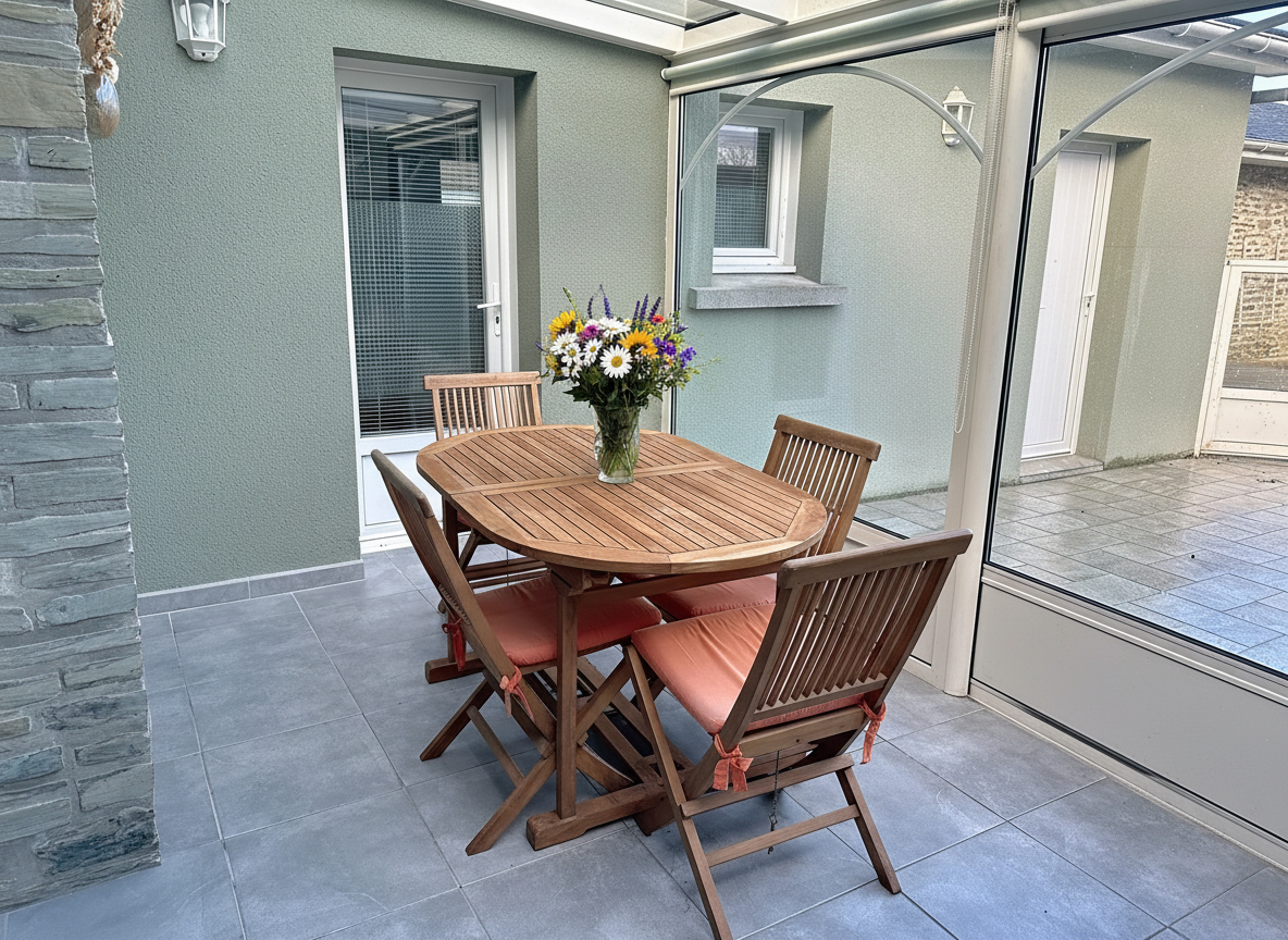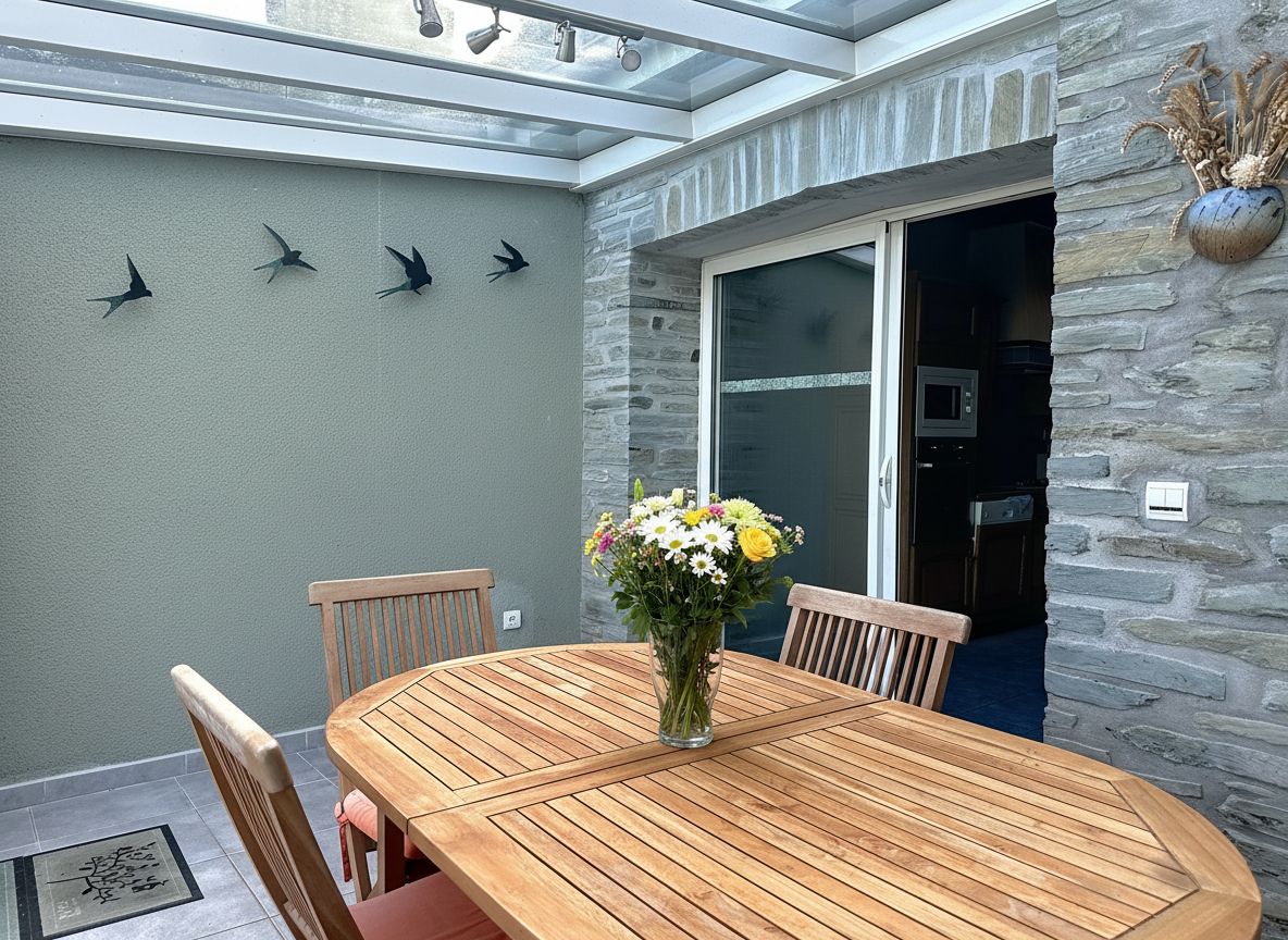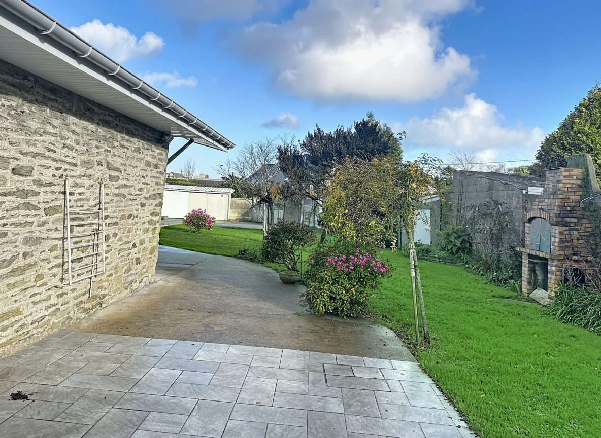 La véranda ouvre sur une terrasse puis sur un jardin clos et arboré. Une grande cour enrobée/bétonnée mène à un spacieux garage doté de deux portes : une porte standard pour voiture et une porte haute adaptée à un camping car ou un camion. Le garage comprend également une mezzanine de rangement, un espace atelier et une cave à vins.