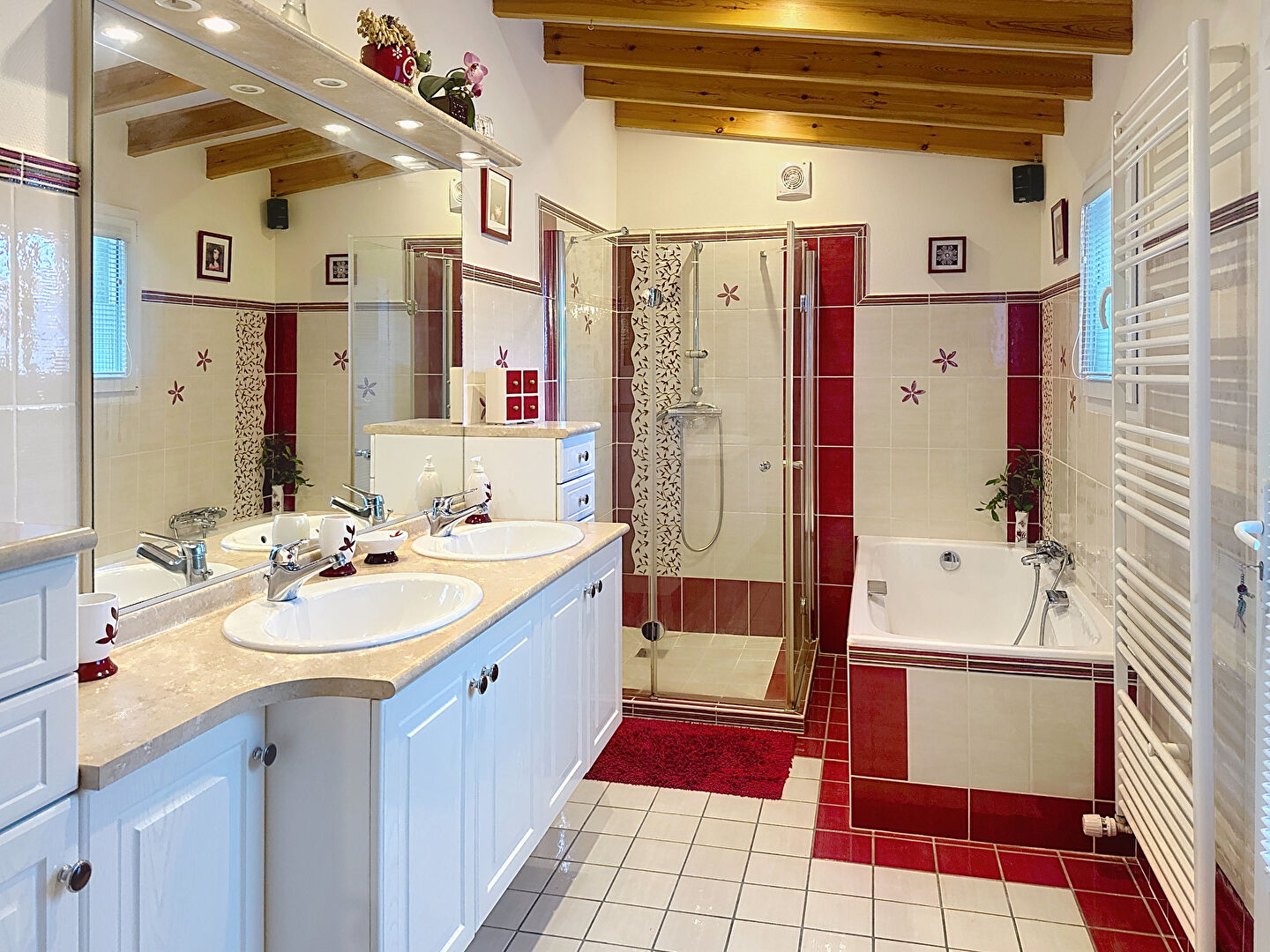 Elle se compose au rez de chaussée d'une entrée avec dégagement, d'un séjour salon équipé d'une cheminée à foyer ouvert, d'un palier avec espace de rangement, ainsi que d'une cuisine aménagée et équipée donnant directement sur la véranda et le jardin. Une suite parentale comprenant une chambre et une salle d'eau avec baignoire complète ce niveau, ainsi qu'un WC avec lave mains.