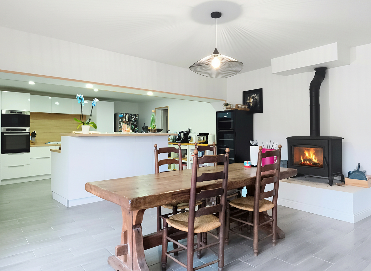 Au rez?de?chaussée, une vaste entrée vous accueille et mène vers une grande pièce de vie lumineuse de 88 m² comprenant un séjour, une salle à manger et une cuisine aménagée et équipée. Un poêle à bois apporte chaleur et convivialité à cet espace. Le niveau comprend également une salle d'eau avec WC, une buanderie ainsi que deux chambres de plain?pied. Un nouvel escalier sera installé avant la vente.