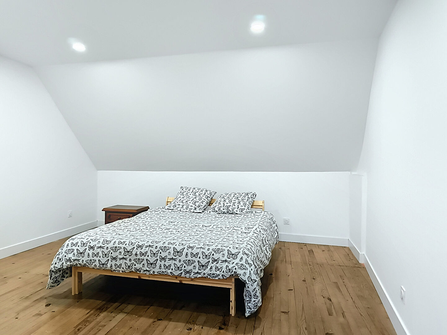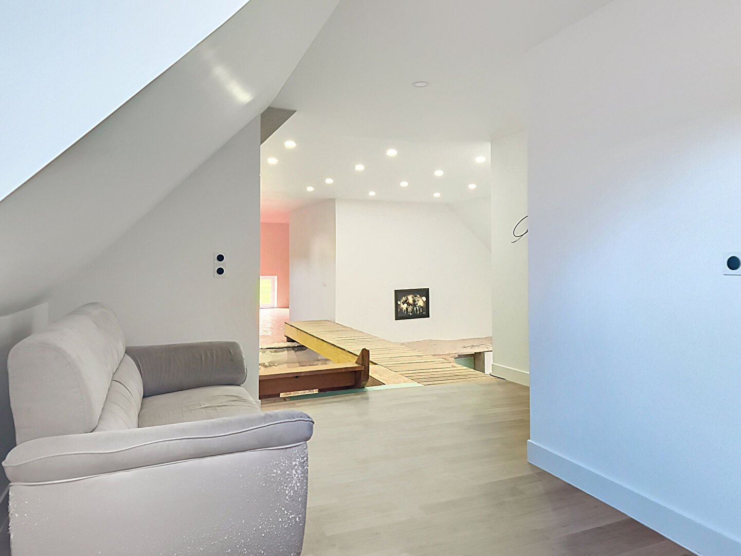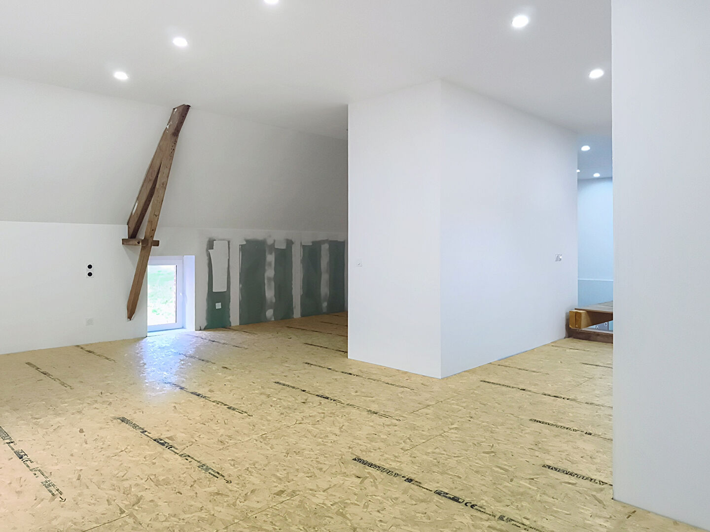À l'étage, le palier dessert deux grandes chambres. De l'autre côté de la passerelle, un espace de 53 m² reste à aménager. Il offre la possibilité de créer une suite parentale avec salle d'eau, les arrivées d'eau étant déjà prévues, ainsi qu'un espace bureau.