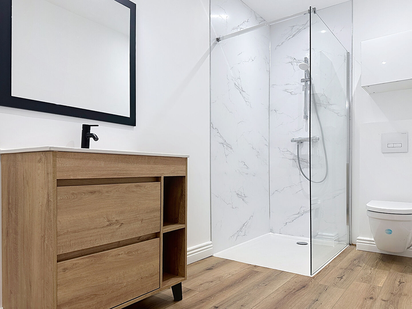Vous trouverez une salle de bain moderne, avec une douche italienne et WC ainsi qu'une chambre au calme offrant une tranquillité optimale.