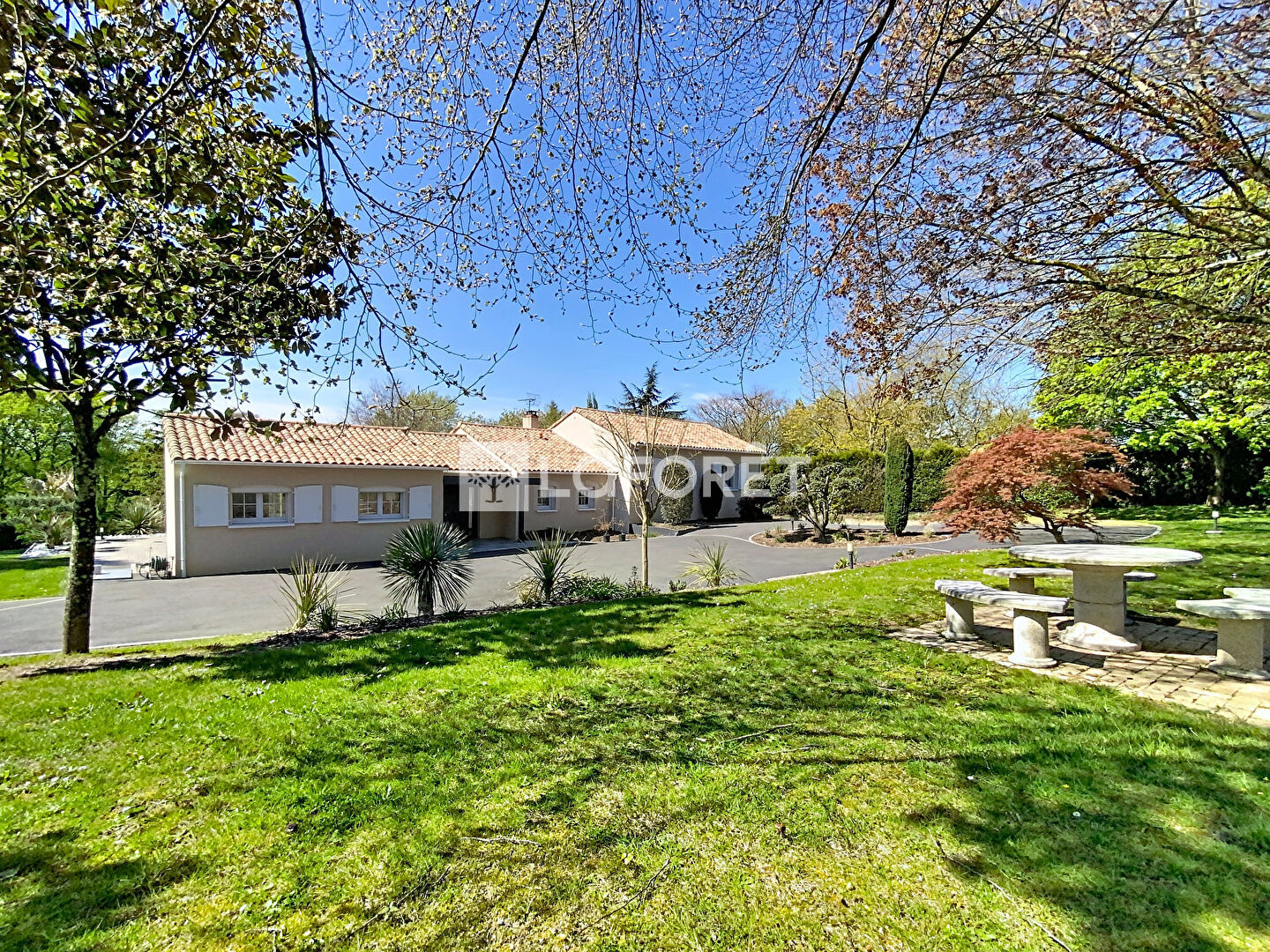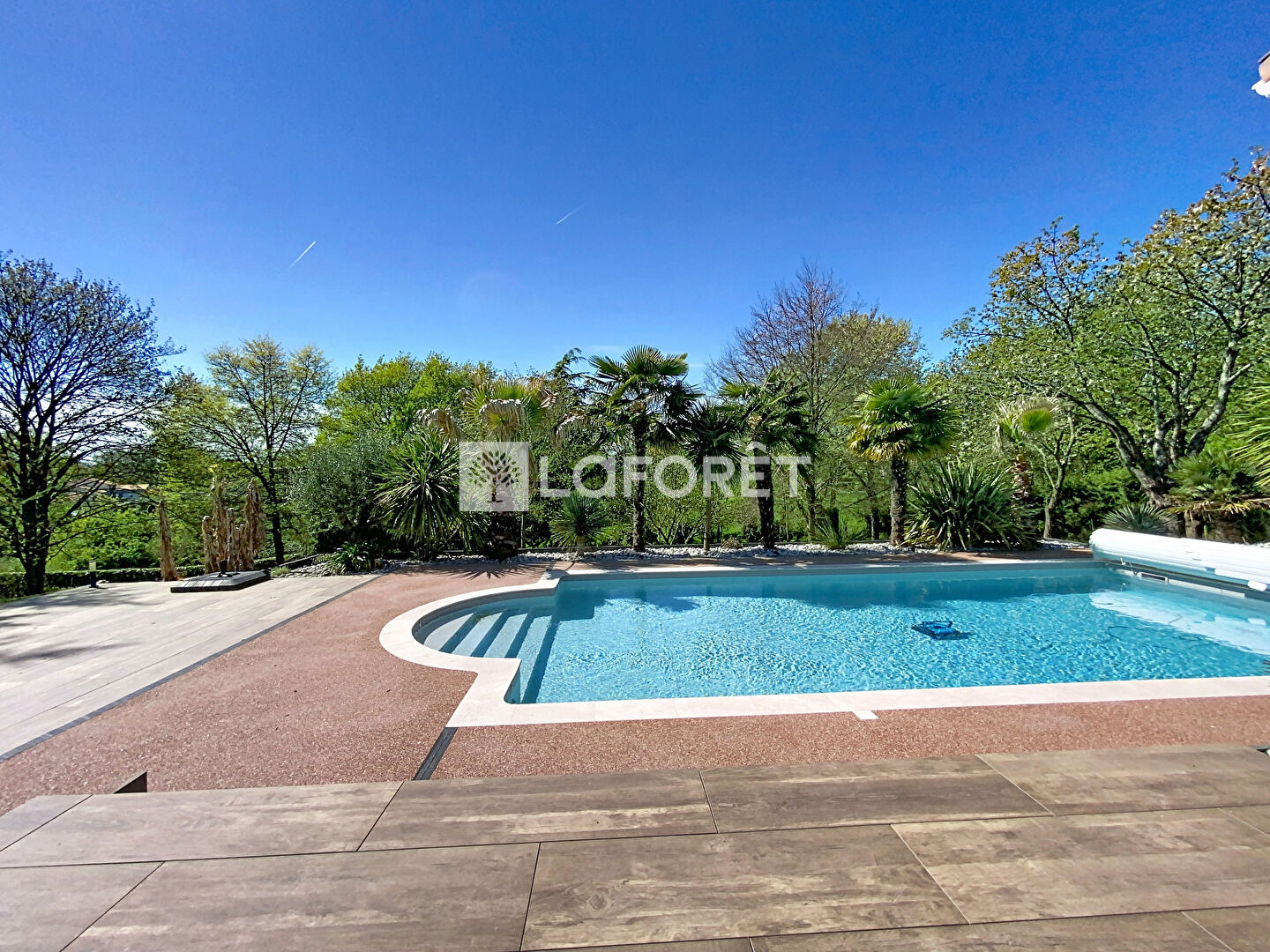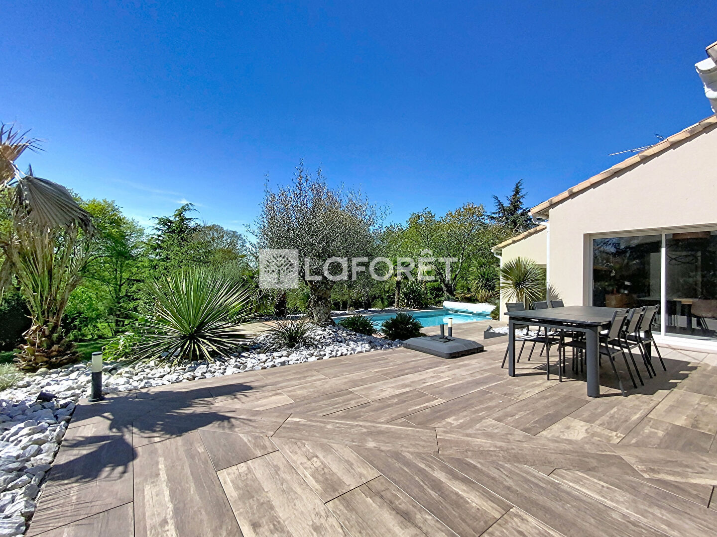 À l'extérieur, le charme opère immédiatement : un parc paysager soigneusement entretenu, entièrement clos, s'articule autour de plusieurs terrasses aux ambiances variées. En son coeur, une piscine chauffée invite à la détente et prolonge les moments de convivialité dans un cadre verdoyant et intimiste.