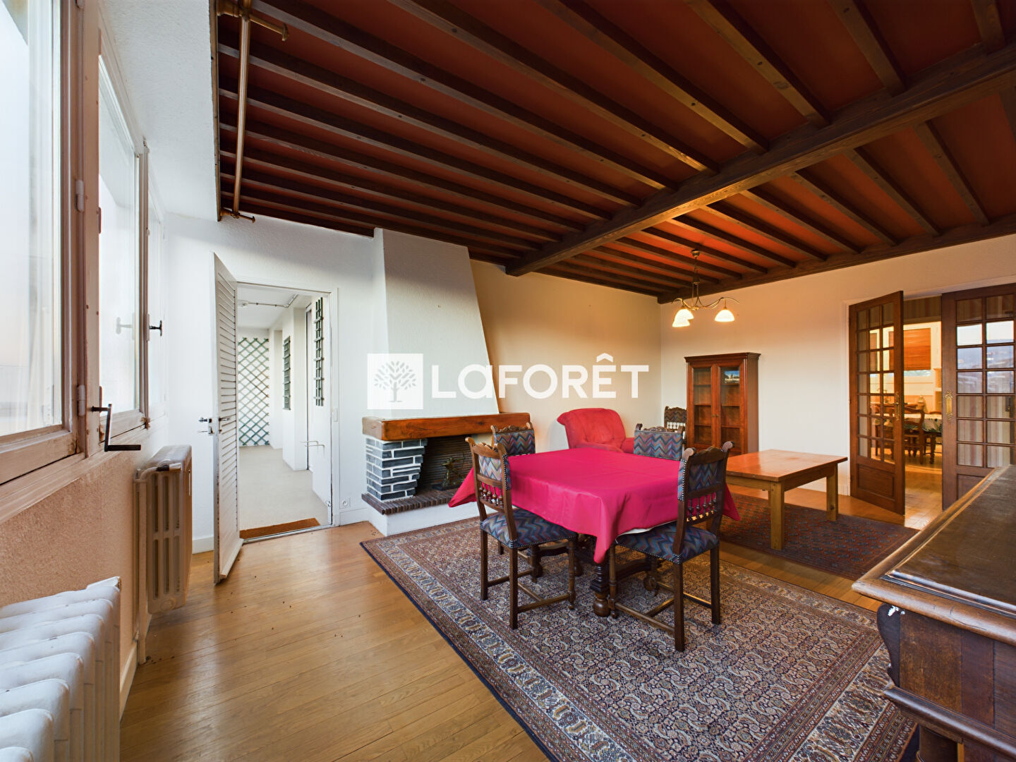 Séjour de 26 m² avec parquet en chêne massif, TV, meubles de rangement et cheminée décorative