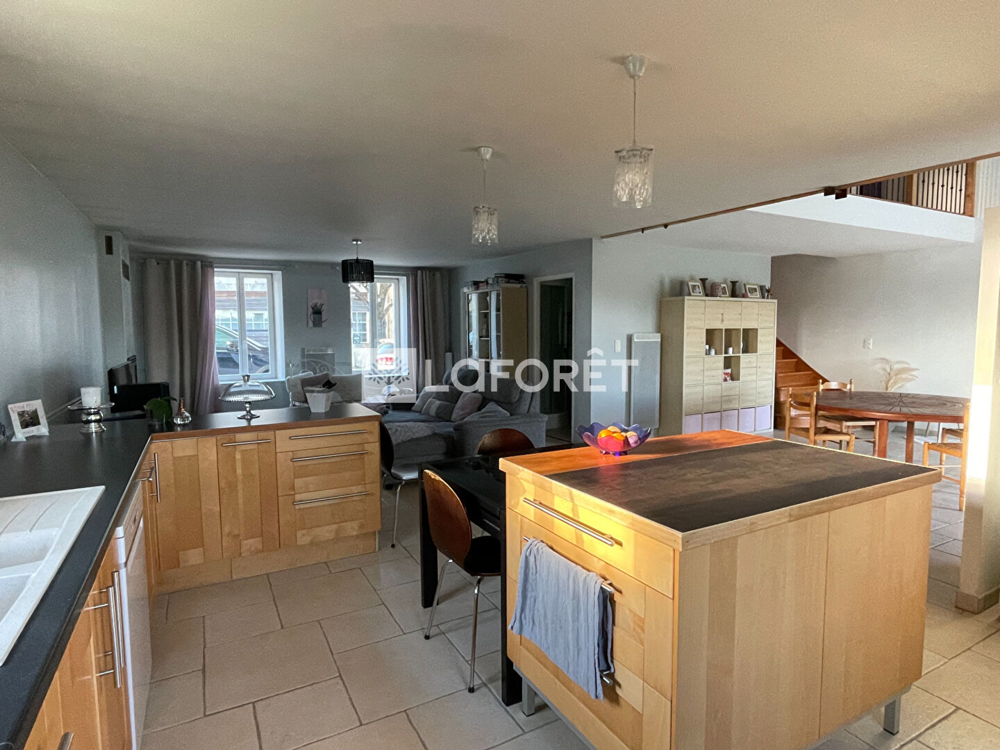 - Au rez de chaussée d'une vaste pièce de vie avec une partie salle à manger, une partie salon et une cuisine ouverte aménagée et équipée, d'une buanderie avec douche, de WC séparé et d'un garage avec une cave.