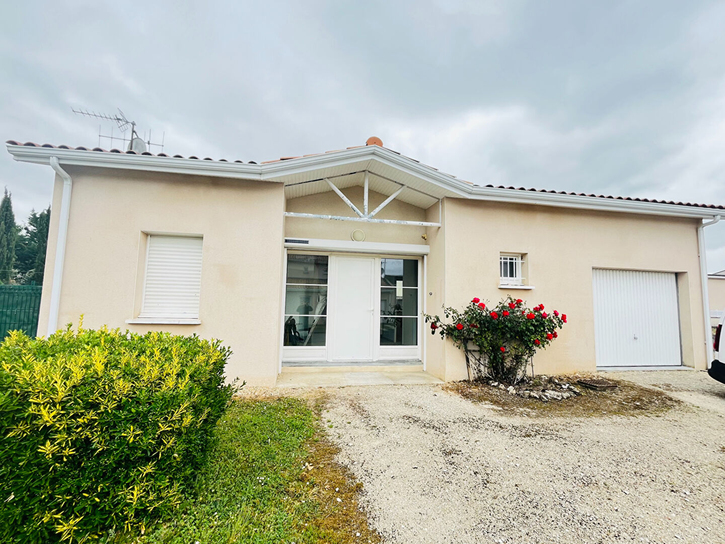 Maison individuelle de plain-pied avec jardin arboré et garage.