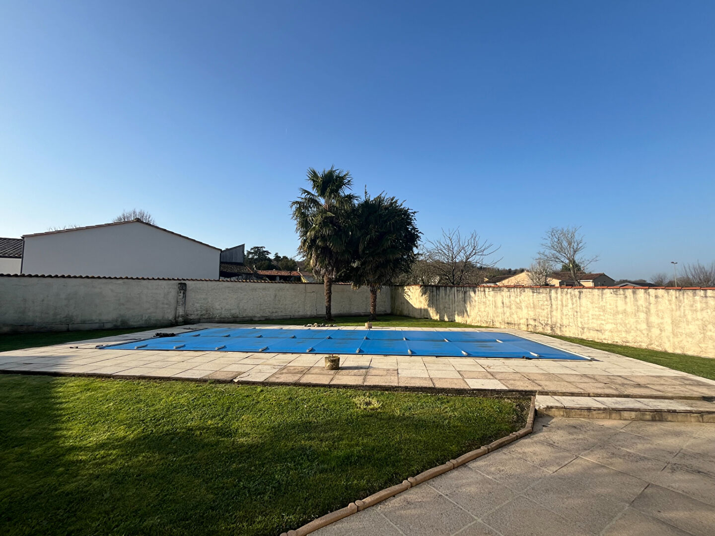 La maison possède un grand garage, un extérieur arboré et paysagé et une piscine avec pompe à chaleur.