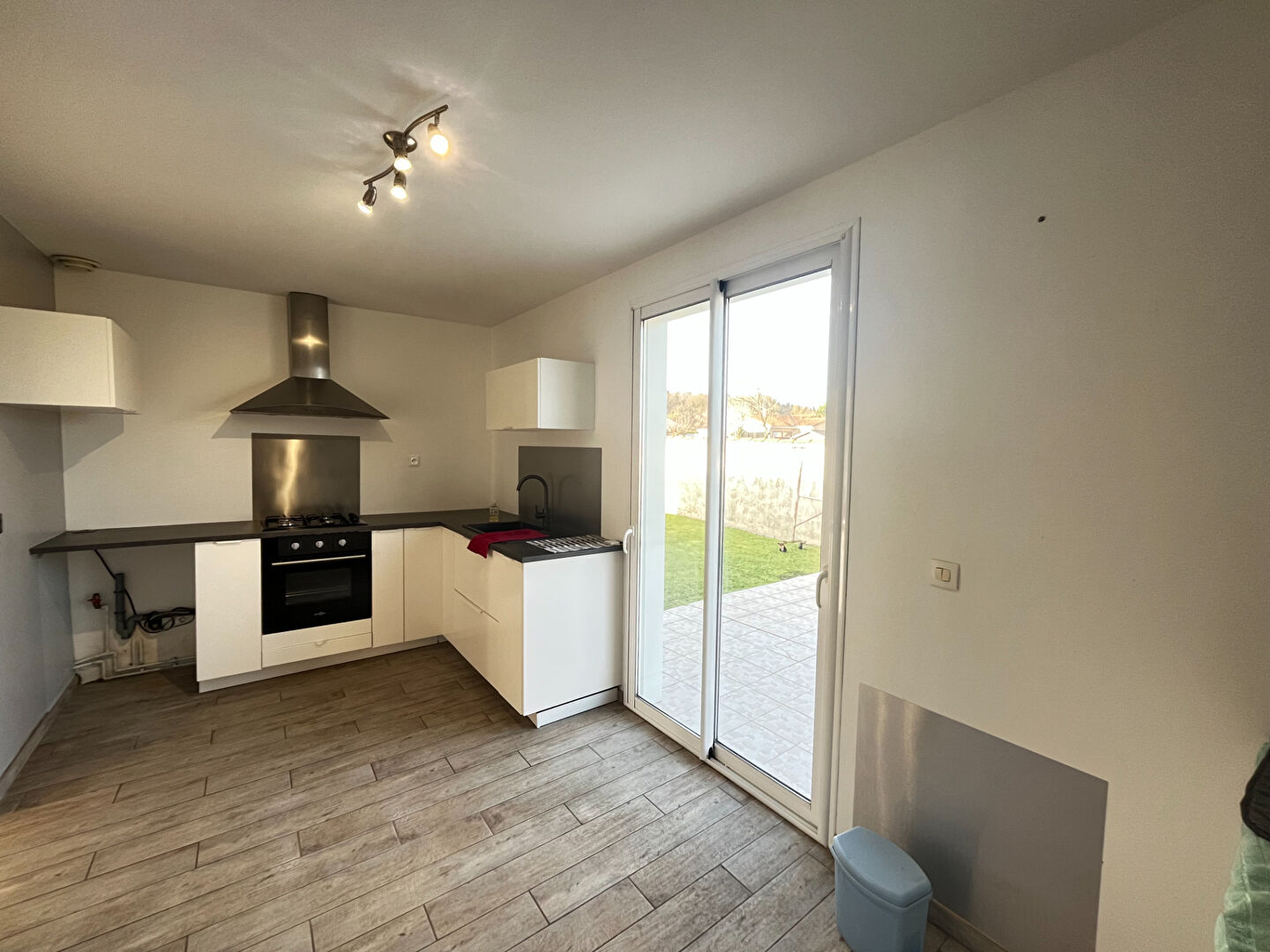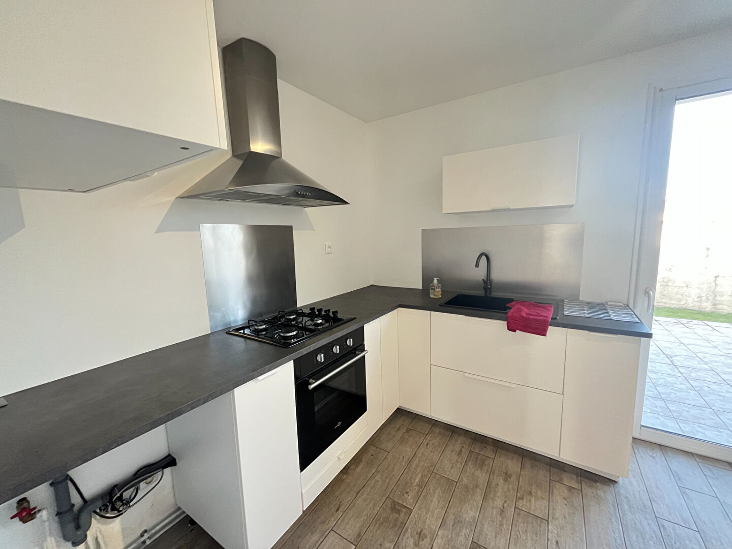 Cuisine aménagé et équipée (plaque, hotte et four) avec accès direct sur la terrasse arrière.